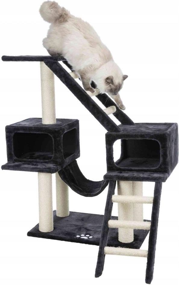 Trixie Drapak Malaga 109cm antracyt [43947] Drapak z dwoma domkami i półką, które są połączone przy pomocy drabinek i drugiej półki. Staranne wykonanie sprawia, że drapak staje się ozdobą pokoju. Słupki oraz szczebelki drabinek są pokryte sizalem, a wykończenie pozostałych elementów jest z przyjemnego pluszu, w szarym kolorze (antracyt). Pięć sizalowych słupków do drapania (średnica 9 cm) Ciekawa konstrukcja drapaka dodatkowo zachęci kota do korzystania z niego. Obecność półek powoduje, że drapak jest atrakcyjny również jako punkt obserwacyjny całego mieszkania lub miejsce wypoczynku. Wymiary górnej półki: 36 x 36 cm Domki pozwalają schronić się i obserwować pokój z ukrycia. Wymiary domków: 45 x 36 x 26 cm Zajmowana powierzchnia podłogi: 70 x 45 cm. Rozmiar gwintu: M8 Ostrzenie pazurów jest dla kota bardzo ważną czynnością. Pozbywa się dzięki temu złuszczających się i rosnących części pazura. Drapak niweluje też niszczenie przez kota mebli i dywanów.