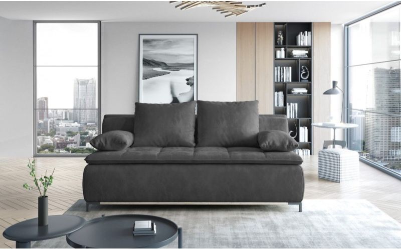 Sofa Sweet z funkcją spania, automatem DL, metalowymi nóżkami i drewnianą listwą. Obszerny pojemnik na pościel i możliwość wyboru tkaniny. Tkanina promocyjna: Riviera 81, 91, 96, 16.