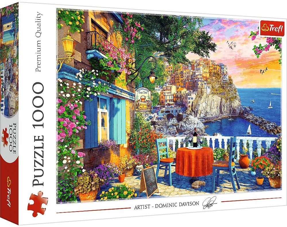 Trefl Puzzle 1000el. Widok na Cinque Terre 10776 Puzzle Widok na Cinque Terre, składające się z 1000 elementów, przedstawiają widok na Cinque Terre, który stworzył artysta Dominic Davison. Po ich ułożeniu powstanie obrazek w rozmiarach 683x480 mm. Produkt wykonano w Polsce, przy użyciu wysokogatunkowych, ekologicznych materiałów. Specjalny kalandrowany papier odbija światło, co ułatwia układanie. Puzzle produkowane od lat! Od 1985 roku w Trefl SA poświęcamy się temu, aby zagwarantować niezapomniane doznania podczas układania puzzli, które produkowane są w 100% w Polsce. Nasze układanki tworzymy z pasją, a każdy element cechuje wysoka jakość wykonania.  Dzięki wykorzystaniu papieru niwelującego odbicie światła, sprawiamy, że układanie staje się jeszcze przyjemniejsze. Po ułożeniu puzzli możesz utrwalić obrazek klejem i powiesić swoje dzieło na ścianie.  Zalety układania puzzli Puzzle to świetna rozrywka dla każdego, niezależnie od wieku czy umiejętności. To także dobry trening dla umysłu i ciała. Układając, wyrównujemy oddech, tempo bicia serca oraz spada ciśnienie krwi. Kompletowanie układanki uczy cierpliwości i wytrwałości, co przekłada się na umiejętności przydatne w codziennym życiu. Odkryj nową pasję już dziś! Szukasz pomysłu na miły wieczór w domowym zaciszu? Układanie puzzli to świetny sposób na spędzenie wolnego czasu w gronie przyjaciół i rodziny a do tego rewelacyjny trening dla mózgu. Szeroki wybór wzorów pozwala wybrać układankę dopasowaną do Twoich zainteresowań. Puzzle są doskonałym prezentem z okazji urodzin lub świąt. Odkryj Niezbędnik Puzzlomaniaka!