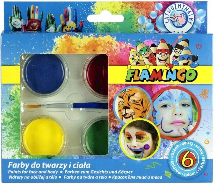 FARBY DO MALOWANIA TWARZY 6 KOLORÓW Zestaw 6 farb do makijażu twarzy i ciała. Proste w użyciu, łatwo się rozprowadzają. Bezpieczne, na bazie wody - nie podrażniają skóry. Trwałe, nie rozmazują się. Świetnie sprawdzą się podczas imprez urodzinowych, karnawału czy dnia dziecka. Idealne także do charakteryzacji osób dorosłych: animatorów zabawy, klaunów, mimów, kibiców, itp. Łatwo zmywalne za pomocą wody z mydłem. W zestawie 6 kolorów: granatowy, czerwony, czarny, żółty, zielony, biały oraz pędzelek.