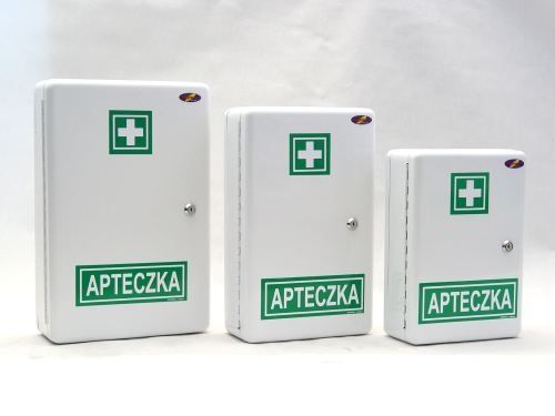 Apteczka spełnia wymagania normy DIN 13164. Apteczka produkowana jest w wersji do zawieszania na ścianie. Szafki wykonane są z blachy stalowej o grubości 1 mm i malowane farbą proszkową poliestrowo-epoksydową w kolorze białym wg RAL 9003. Apteczki zamykana jest na zatrzask. Konstrukcja szafek spełnia wymogi PN. Apteczka dzięki niewielkim rozmiarom (48x28x12cm) zajmuje bardzo mało miejsca. Skład wyposażenia (2xDIN13164): 1. Kompres 10 x 10 cm (2 szt.) sterylny - 6 kpl. 2. Opaska elastyczna 4m x 6cm - 4 szt. 3. Opaska elastyczna 4m x 8cm - 6 szt. 4. Plaster 10 x 6 cm (8szt.) - 2 kpl. 5. Plaster 5m x 2,5 cm - 2 szt. 6. Opatrunek indywidualny M sterylny - 6 szt. 7. Opatrunek indywidualny G sterylny - 2 szt. 8. Chusta opatrunkowa 40 x 60 sterylna - 4 szt. 9. Chusta opatrunkowa 60 x 80 sterylna - 2 szt. 10. Chusta trójkątna - 4 szt. 11. Koc ratunkowy - 2 szt. 12. Nożyczki 14,5 cm - 2 szt. 13. Rękawice winylowe - 8 szt. 14. Chusteczka alkoholowa - 4 szt. 15. Ustnik do sztucznego oddychania - 2 szt. 16. Instrukcja udzielania pierwszej pomocy - 1 szt. Termin ważności środków opatrunkowych - 5 lat. Apteczka wygląda bardzo estetycznie, za niewielką cenę dostajemy towar wysokiej jakości. Przy zakupie większej ilości proponujemy indywidualną wycenę oraz atrakcyjne rabaty. Jeżeli maja Państwo jakiekolwiek pytania służymy pomocą.