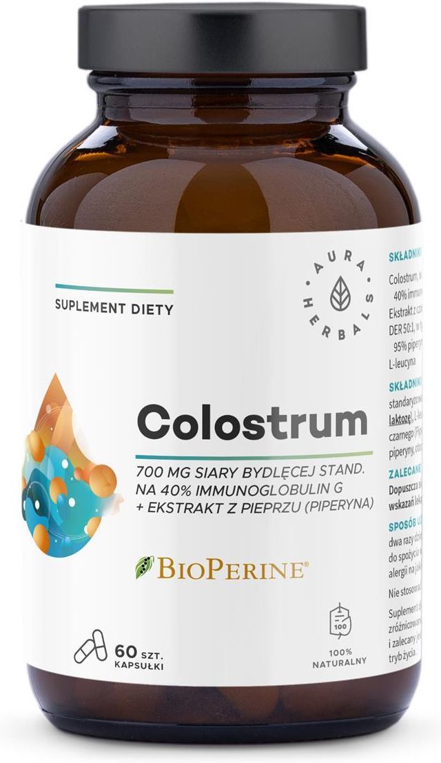 Colostrum 700 mg + BioPerine®, Aura Herbals kapsułki 60 szt. Colostrum - siara bydlęca + ekstrakt z czarnego pieprzu Suplement diety w kapsułkach z celulozy roślinnej Dlaczego warto wybrać Colostrum 700 mg + BioPerine® w kapsułkach Aura Herbals? 100% naturalnych składników colostrum - siara bydlęca standaryzowane na 40% immunoglobulin G markowy ekstrakt BioPerine® z czarnego pieprzu standaryzowany na 95% piperyny roślinne kapsułki – otoczka kapsułki z celulozy roślinnej clean label - najprostszy skład, bez zbędnych dodatków Szczególne właściwości składników aktywnych Czarny pieprz wspiera system odpornościowy. Gwarancja jakości preparatu Colostrum 700 mg + BioPerine Colostrum zawarte w produkcie Colostrum 700 mg + BioPerine® zostało pozyskane tylko z 1. i 2. dojenia, czyli w ciągu pierwszych 12 godzin po urodzeniu cielaka. Procedury te zostały objęte najwyższymi standardami jakości, a dostawcami surowca są rolnicy, którzy nie zmienili swojej proekologicznej filozofii od lat. Surowiec został wytworzony na zimno w sposób delikatny i bezstratny. To procedura czysto fizyczna, w której nie zastosowano żadnych chemikaliów. Dzięki temu została utrzymana aktywność biologiczna, a wszystkie najważniejsze składniki i właściwości zostają zachowane w preparacie końcowym. Colostrum zostało stworzone zgodnie z międzynarodowymi standardami żywności, a każda partia została poddana certyfikowanej analizie. BioPerine® to markowy ekstrakt z czarnego pieprzu wyprodukowany przez firmę Sabinsa Corporation. Firma obecna jest na rynku już od ponad 40 lat, a jej główna działalność to produkcja standaryzowanych roślinnych ekstraktów. Skuteczność produktów Sabinsa Corporation weryfikowana jest w badaniach przeprowadzanych w prestiżowych i zaufanych jednostkach badawczych. Nad jakością badań czuwa aż 120 naukowców, którzy nieustannie sprawdzają możliwości ekstraktów roślinnych w zakresie poprawiania jakości życia i zdrowia. Wykonane badania Produkt został przebadany w niezależnej jednostce laboratoryjnej w celu zagwarantowania najwyższej jakości i bezpieczeństwa stosowania suplementu diety. Badania potwierdziły: brak zanieczyszczenia metalami ciężkimi brak zanieczyszczenia mikrobiologicznego Ważne informacje Zalecane dzienne spożycie Zalecana porcja do spożycia: 2 kapsułki Nie przekraczaj zalecanej dziennej porcji do spożycia. Składniki w dziennej porcji (2 kapsułki) Colostrum (700 mg), w tym: 40 % immunoglobulin G (IgG) 280 mg Ekstrakt z czarnego pieprzu BioPerine® DER 50:1 (2,1 mg), w tym: 95% piperyny (2 mg) L-leucyna, 17,9 mg Sposób użycia 1 kapsułkę popić wodą. Stosować dwa razy dziennie. Dodatkowe informacje Nie należy przekraczać zalecanej porcji do spożycia w ciągu dnia. Nie stosować u dzieci, kobiet w ciąży i w trakcie laktacji. Należy pamiętać, że bardzo ważny i zalecany jest zrównoważony sposób żywienia i zdrowy tryb życia. Nie stosować w przypadku alergii na jakikolwiek składnik suplementu. Suplement diety nie może być stosowany jako substytut zróżnicowanej diety. Składniki Liofilizowane colostrum (siara bydlęca), standaryzowane na 40% immunoglobulin g (mleko), l-leucyna, bioperine® – ekstrakt z owoców pieprzu czarnego (piper nigrum) der 50:1 standaryzowany na 95% piperyny, otoczka kapsułki: hydroksypropylometyloceluloza. Ilość netto 60 kapsułek Przechowywanie Przechowuj w suchym miejscu w temperaturze 15-25°C, w sposób niedostępny dla małych dzieci. Najlepiej spożyć przed Data ważności i numer partii na opakowaniu. Producent Aura Herbals Sp. z o. o. ul. Grunwaldzka 49/2 81-754 Sopot