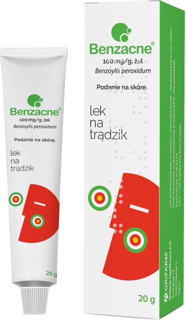 Benzacne to lek w postaci żelu, stosowany miejscowo na skórę w leczeniu różnych postaci trądziku pospolitego. Lek łatwo przenika do warstwy rogowej naskórka i hamuje rozwój bakterii beztlenowych. Skład: Substancją czynną leku jest benzoilu nadtlenek. 1 g żelu zawiera 100 mg benzoilu nadtlenku. Substancje pomocnicze leku to karbomer, sodu wodorotlenek, woda oczyszczona. Wskazania i działanie Wskazania: leczenie różnych postaci trądziku pospolitego (Acne vulgaris). Lek zawiera substancję czynną benzoilu nadtlenek. Benzoilu nadtlenek po zastosowaniu na skórą łatwo przenika do warstwy rogowej naskórka i hamuje rozwój bakterii beztlenowych Propionobacterim acne, będących jedną z przyczyn trądziku pospolitego. Działa on także złuszczająco na naskórek, zmniejsza liczbę zaskórników. Dawkowanie: Lek jest przeznaczony do stosowania miejscowego na skórę. Dorośli i dzieci w wieku powyżej 12 lat: Stosować raz lub dwa razy na dobę. Po umyciu i osuszeniu trądzikowej skóry na chorobowo zmienione miejsca nanieść niewielką ilość leku - wystarczającą do ich pokrycia - i delikatnie wetrzeć. Po użyciu leku należy umyć ręce. Zwykle w ciągu 2 do 3 pierwszych tygodni leczenia stosuje się lek o zawartości nadtlenku benzoilu 50 mg/g i w razie konieczności kontynuuje leczenie lekiem o zawartości nadtlenku benzoilu 100 mg/g. W przypadku wrażenia, że działanie leku jest za mocne lub za słabe, należy zwrócić się do lekarza. Przeciwwskazania: Kiedy nie stosować leku Benzacne: jeśli pacjent ma uczulenie na substancję czynną lub którykolwiek z pozostałych składników tego leku; jeśli u pacjenta występują wypryski (egzema), przewlekłe zapalenie skóry, oparzenia skóry, również wywołane nadmierną ekspozycją na słońce. Interakcje: Należy powiedzieć lekarzowi o wszystkich lekach, stosowanych przez pacjenta obecnie lub ostatnio, a także o lekach, które pacjent planuje stosować. Działania niepożądane: Jak każdy lek, Benzacne może powodować działania niepożądane, chociaż nie u każdego one wystąpią. W trakcie stosowania leku Benzacne może wystąpić: przesuszenie lub nadmierne łuszczenie się skóry, zaczerwienienie skóry, uczucie ciepła lub delikatnego kłucia w miejscu nałożenia leku. Objawy te mogą pojawić się w pierwszym tygodniu leczenia i nie stanowią one wskazania do odstawienia leku. W przypadku ich wystąpienia należy zmniejszyć częstość stosowania leku Benzacne. W przypadku wystąpienia następujących objawów należy zaprzestać stosowania leku i skontaktować się z lekarzem: alergiczne zapalenie kontaktowe lub bolesne podrażnienie skóry, pieczenie skóry, wysypka skórna. Jeśli nasili się którykolwiek z objawów niepożądanych lub wystąpią jakiekolwiek objawy niepożądane niewymienione w ulotce, należy powiadomić lekarza lub farmaceutę. Ostrzeżenia i środki ostrożności: Przechowywać w sposób niedostępny dla małych dzieci. Przechowywać w temperaturze pokojowej. Chronić od światła i wilgoci. Jeśli pacjentka jest w ciąży lub karmi piersią, przypuszcza, że może być w ciąży lub gdy planuje mieć dziecko, powinna poradzić się lekarza lub farmaceuty przed zastosowaniem tego leku. Nie należy nakładać leku na okolicę gruczołu sutkowego w przypadku karmienia piersią. Nie stosować u dzieci w wieku poniżej 12 lat. Producent: Takeda Pharma ul. Prosta 68, 00-838 Warszawa