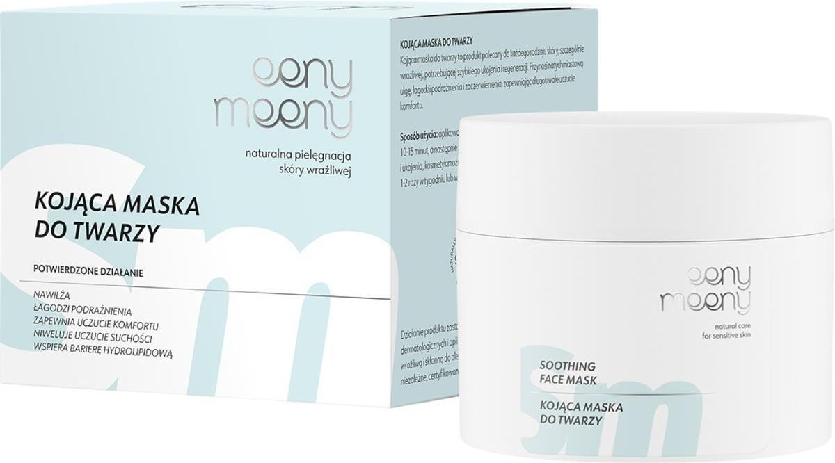 Natychmiastowe ukojenie wrażliwej skóry - Kojąca Maska - Eeny Meeny Skuteczność maseczki do twarzy wynika ze starannie dobranych składników aktywnych, takich jak ektoina, która intensywnie nawilża, wzmacnia barierę hydrolipidową i chroni skórę przed wysuszeniem, oraz trehaloza, która łagodzi podrażnienia i redukuje nieprzyjemne uczucie ściągnięcia, przywracając skórze komfort. Aż 90% badanych potwierdziło, że maseczka zapewnia natychmiastowe i długotrwałe uczucie nawilżenia, jednocześnie skutecznie eliminując uczucie ściągnięcia. Działanie łagodzące wzmacnia Dermasooth™, czyli roślinny kompleks z bazylii azjatyckiej, ostropestu plamistego i zielonej algi. Składniki te skutecznie łagodzą zaczerwienienia i podrażnienia, co potwierdziło 85% badanych. Dodatkowo sól sodowa niskocząsteczkowego kwasu poliglutaminowego, zastosowana w formule maseczki, zapobiega nadmiernemu odparowywaniu wilgoci, zapewniając długotrwałe uczucie świeżości i nawilżenia. Maska pełna odżywczych ekstraktów i olejów Maska do twarzy została wzbogacona o ekstrakt z alg Laminaria, bogaty w witaminy A, E i D, który zapobiega przesuszeniu skóry i nawrotom suchości. Fermentowany jęczmień zapewnia natychmiastowe ukojenie, potwierdzone przez 85% badanych, oraz długotrwałe nawilżenie, utrzymujące się nawet do 8 godzin. Dodatkowo, pozyskiwany w naszym laboratorium, ekstrakt z korzenia cykorii wzmacnia naturalną barierę skóry i wykazuje działanie antyoksydacyjne. Formuła maski zawiera również jedwabisty proszek z ziaren owsa, który intensywnie nawilża i koi suchą, podrażnioną skórę. Natomiast oleje z kiełków pszenicy i pestek oliwek głęboko odżywiają, wspomagają regenerację i zapewniają skórze miękkość oraz intensywne nawilżenie. Aż 95% osób stosujących produkt potwierdziło, że po jego użyciu skóra staje się wyraźnie gładsza i zregenerowana. Kremowa formuła, która otula i koi skórę Kojąca maseczka ma aksamitną, kremową konsystencję, co docenili wszyscy uczestnicy badań – 100% z nich uznało jej konsystencję za odpowiednią. Produkt łatwo się aplikuje i rozprowadza, co potwierdziło 95% badanych, a 90% osób przyznało, że maseczka z łatwością spłukuje się wodą. Jej naturalny niebieski kolor pochodzi z ekstraktu z owoców genipa, który nie tylko nadaje jej subtelny odcień, ale także wykazuje silne właściwości antyoksydacyjne. Maskę można stosować doraźnie – w przypadku silnego podrażnienia, np. po intensywnych zabiegach kosmetycznych – lub regularnie, w zależności od potrzeb skóry. Aby uzyskać najlepsze efekty, należy nałożyć maskę na oczyszczoną skórę twarzy, szyi i dekoltu, pozostawić na 10–15 minut, a następnie spłukać letnią wodą. W przypadku potrzeby intensywnej regeneracji i ukojenia można wmasować kosmetyk w skórę i pozostawić na całą noc. Pojemność: 50 ml Stosowanie Aplikować na oczyszczoną skórę twarzy, szyi i dekoltu. Pozostawić na 10-15 minut, a następnie zmyć letnią wodą. W przypadku potrzeby silnej regeneracji i ukojenia, kosmetyk można wmasować w skórę i pozostawić na całą noc. INCI Aqua, Glycerin, Sorbitol, Propanediol, Olea Europaea Fruit Oil, Triticum Vulgare Germ Oil, Coco-Caprylate/Caprate, Glyceryl Stearate Citrate, Cetearyl Alcohol, Propanediol Dicaprylate, Caprylic/Capric Triglyceride, C10-18 Triglycerides, Cetyl Alcohol, Avena Sativa Kernel Flour, Trehalose, Butyrospermum Parkii Butter, Saccharomyces/Barley Seed Ferment Filtrate, Ectoin, Allantoin, Rhus Verniciflua Peel Cera, Helianthus Annuus Seed Oil, Laminaria Hyperborea Extract, Laminaria Digitata Extract, Genipa Americana Fruit Extract, Cichorium Intybus Root Extract, Ocimum Sanctum Leaf Extract, Enteromorpha Compressa Extract, Silybum Marianum Fruit Extract, Dipotassium Glycyrrhizate, Sodium Hyaluronate, Sodium Polyglutamate, Tocopherol, Biosaccharide Gum-1, Ascorbyl Palmitate, Xanthan Gum, Sodium Anisate, Tetrasodium Glutamate Diacetate, Sodium Levulinate, Phenethyl Alcohol, Glyceryl Caprylate, Ethylhexylglycerin, Citric Acid, Parfum