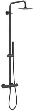 Termo Round zestaw prysznicowy termostatyczny, czarny mat Zestaw prysznicowy Rain Termo Round to idealne rozwiązanie do strefy prysznica, gdy w łazience istnieją standardowe wyprowadzenia wody pod baterię prysznicową- z głowicą górną i słuchawką. Zestaw wykonany z mosiądzu, posiada głowicę termostatyczną, dzięki niej zestaw jest bezpieczniejszy do użytkowania przez dzieci lub osoby wymagające szczególnej troski. Zmiany wylotu wody głowica/słuchawka dokonujemy pry pomocy mechanicznego przełącznika. Regulowany wysięg drążka pozwala na swobodne dostosowanie do osób o różnym wzroście.