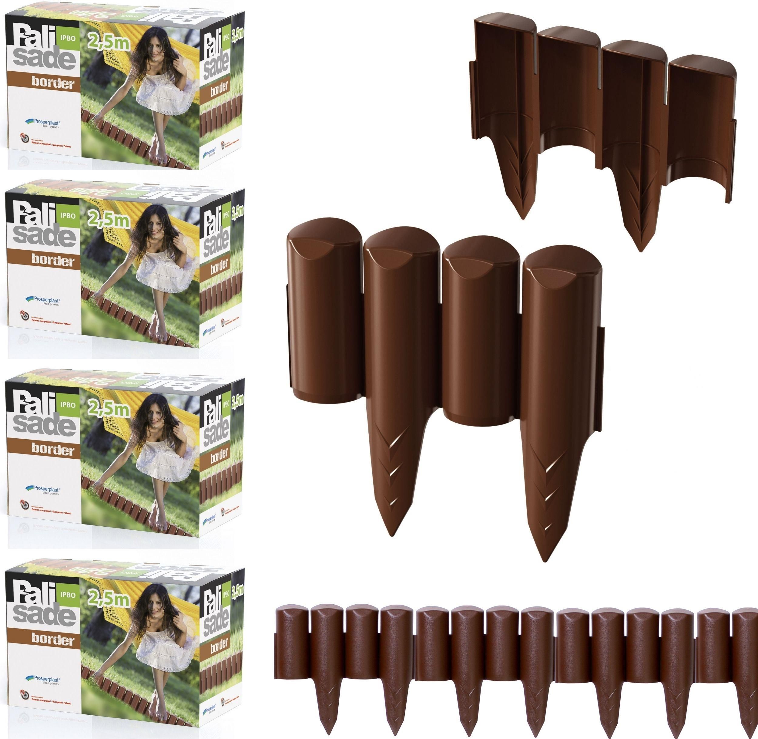 Palisada ogrodowa Border IPBO 10m - brąz Specyfikacja : długość całkowita - 10m długość pojedynczego elementu - 25 cm wysokość palika - 13 cm wysokość całkowita - 22,8 cm liczba elementów - 40 szt. Zestaw zawiera: 4 opakowania po 2,5m - całość 10m Palisada pozwala na efektowne i trwałe oddzielenie przestrzeni wokół domu i ogrodzie. Odporna na trudne warunki atmosferyczne. Wykonana na zasadzie elastycznych modułów, które umożliwiają tworzenie ogrodzeń o wyszukanych kształtach. Wykonana na zasadzie elastycznych modułów, które umożliwiają tworzenie ogrodzeń o wyszukanych kształtach. Aranżacja: