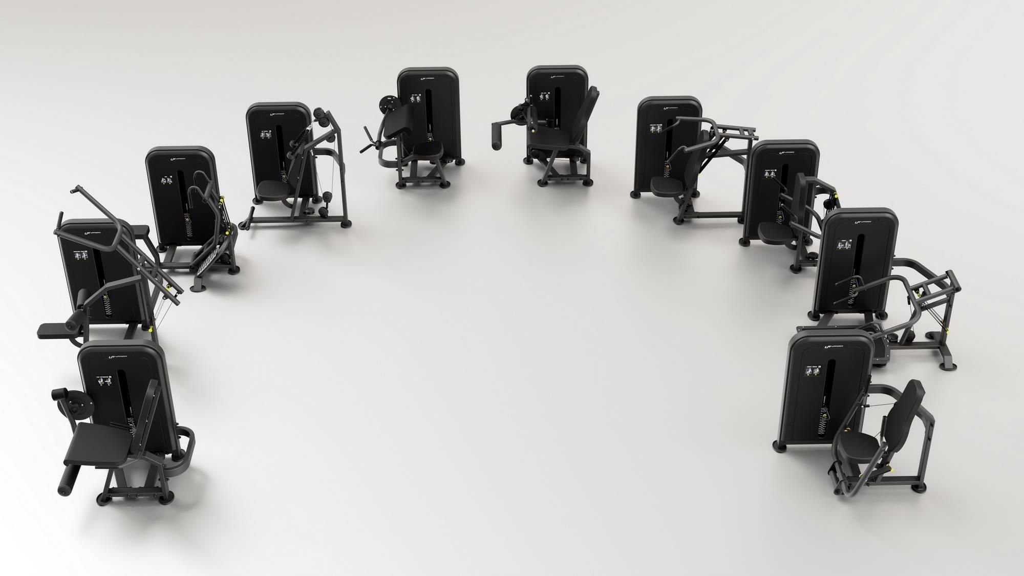 Zestaw dziesięciu maszyn przeznaczonych do treningu obwodowego. Dzięki eliminacji zbędnych konfiguracji i konieczności każdorazowego dopasowywania maszyny do ćwiczącego, maszyna idealnie sprawdzi się w treningu dla osób początkujących. Skład zestawu: Klatka piersiowa US-U001 Barki US-U002 Przysiad US-U003 Brzuch US-U004 Plecy US-U005 Plecy US-U006 Biceps US-U007 Triceps US-U008 Czworogłowe Uda US-U009 Dwugłowe Uda US-U010 Zastosowane rozwiązania Precyzyjna zmiana ciężaru Stos wykonany jest ze stali. Na każdej sztabce znajduje się naklejka informująca o łącznej wadze w kilogramach oraz funtach. Uchwyt przetyczki do regulacji stosu został wykonany z aluminium, sama przetyczka jest zabezpieczona linką spiralną. Tabliczka instruktażowa Na obudowie maszyny umieściliśmy grafikę, która w prosty i zrozumiały sposób pokazuje jak prawidłowo korzystać z maszyny oraz obrazuje, które mięśnie są ćwiczone. Oddychająca tapicerka Oparcia i siedziska w maszynach UpForm S-line posiadają dodatkową, cienką warstwę specjalnej pianki, która w połączeniu z perforowanym materiałem tworzy wygodną i oddychającą tapicerkę, która znaczące zmniejsza pocenie się podczas intensywnych ćwiczeń. Gumowane uchwyty Uchwyty wykonane są z formowanej termicznie gumy odpornej na pot, uszkodzenia i przetarcia. Ich końce zabezpieczone są aluminiowym kołnierzem z logo, który zapobiega ich ślizganiu się podczas treningu. Podesty na nogi Wszystkie oparcia stóp wykonane są z blachy nierdzewnej oraz dodatkowo zabezpieczone są elementami gumowymi tworzącymi bezpieczną, antypoślizgową powierzchnię.