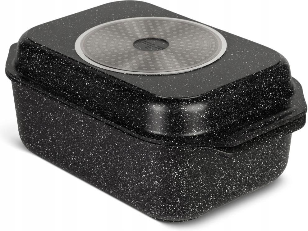 Brytfanna marmurowa dwu funkcyjna Naczynie niezbędne w każdej kuchni, idealne do dań dla całej rodziny. Można w nim piec, gotować, smażyć i grillować Brytfanna ceramiczno-marmurowa to wysokiej jakości naczynie, które pełni funkcję garnka i patelni. Umożliwia przygotowywanie soczystych i kruchych potraw, które zachowują swoje witaminy i wartości odżywcze. Doskonale nadaje się do pieczenia mięsa, drobiu, warzyw, zapiekanek, potraw jednogarnkowych, a nawet ciast i chleba. Brytfanna z powłoką marmurową pozwala przyrządzać potrawy zdrowe i smaczne – można używać ją bez dużych ilości tłuszczu. Posiada specjalną marmurową i nieprzywierającąpowłokę, która zapobiega przypalaniu się jedzenia i dba o utrzymanie wartościowych składników w potrawie. Brytfanna ceramiczno-marmurowa wykonana jest z trwałego stopu aluminium z powłoką marmurową, równomiernie i szybkorozprowadzaciepło i jest prosta w czyszczeniu. Sprawdza się na wszystkich rodzajach kuchenek - halogenowych, ceramicznych, gazowych oraz indukcyjnych, ponadto może być stosowana w piekarniku. Zachwyca nie tylko wszechstronnąfunkcjonalnością, ale również swoim ekskluzywnym wyglądem. Marmurowa powłoka w modnych odcieniach, nowoczesny prostokątny kształt oraz dbałość o wszelkie detale sprawia, że brytfanna jest prawdziwą ozdobą każdego wnętrza kuchennego. Cechy produktu Wykonana z odlewanego aluminium dzięki czemu jest wytrzymała i lekka Zestaw składa się z brytfanny głębokiej oraz brytfanny/patelni grillowej Patelnia grillowa może również służyć jako przykrywka Przystosowana do gotowania i pieczenia niskotłuszczowego Brytfanka jest energooszczędna dzięki specjalnemu przewodnictwu termicznemu. Długo utrzymuje ciepło Pokryta powłoką marmurową, która zapobiega przywieraniu Łatwa w utrzymywaniu czystości, bezpieczna w zmywarkach Przystosowana do pieczenia w piekarnikach Brytfanka przystosowana do kuchenek gazowych, ceramicznych, elektrycznych i indukcyjnych; patelnia przystosowana do kuchenek gazowych i elektrycznych. Pojemność: 9 l Wymiar: 34 cm