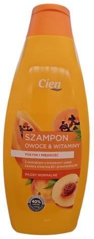 Szampon do włosów Owoce i Witaminy Cien 500 ml Połysk i miękkość - Szampon z ekstraktem z brzoskwini i papai, zawiera witaminę B3 i prowitaminę B5. Szampon został opracowany specjalnie dla włosów normalnych. Szampon o świeżym, owocowym zapachu jest idealny do codziennej pielęgnacji włosów normalnych. Specyfikacja: szampon do włosów normalnych zawartość 500 ml