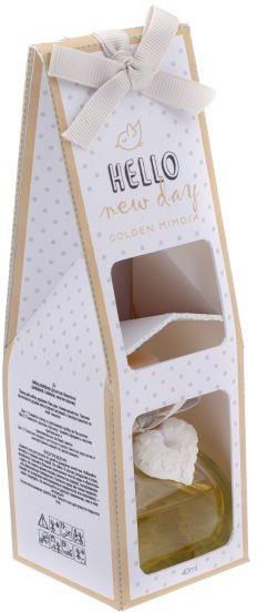 Zestaw o świeżym zapachu Hello new day. Służy jako element dekoracyjno-zapachowy do domu. Gdy włożymy włoskowate patyczki do pojemnika z zapachem, wonny zapach jest uwalniany powoli w sposób ciągły. Pojemność pojemnika szklanego 30 ml. Dzięki eleganckiemu dyfuzorowi piękny zapach rozniesie się po całym domu, co poprawi nasze samopoczucie i nada niepowtarzalny klimat. Wzór: Hello new day Produkt dyfuzor z olejkiem zapachowym ratanowe patyczki prezentowe pudełko Wymiary dyfuzor poj. 30 ml pudełeczko 18 cm x 6 cm x 5,5 cm Materiał drewno szkło Użytkowanie zapach do wnętrza