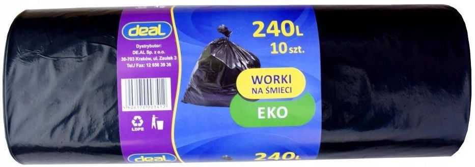 Worki na śmieci 240L eko LD 10szt DEAL Worki na śmieci 240L eko LD 10szt. Worki na śmieci z folii LDPE są bardzo mocne i rozciągliwe, niezbędne w każdej Firmie i domu na odpadki i śmieci. Zapewniają komfort i bezpieczeństwo. Worki przeznaczone są do pakowania śmieci, odpadów oraz segregacji ale mogą być wykorzystywane do wielu innych celów np. ochrony różnego rodzaju przedmiotów przed wilgocią. Cena za 1 rolkę.
