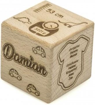 Deku - Kostka drewniana z metryczką 5x5x5 cm szlifowana i frezowana - 000096 Kostka wykonana jest z litego drewna bukowego. Na jej bokach znajduje się wygrawerowana laserem CNC metryczka. Ciekawy i cieszący się dużą popularnością produkt, który oczywiście możesz spersonalizować na własny sposób. Mogą znajdować się na niej takie informacje jak: imię, data urodzin, imienin, wiek, waga, wzrost, godzina narodzin, imiona rodziców, imiona chrzestnych, grupa krwi i inne. Promień zaokrąglenia boków kostki to 3 mm. Zaokrąglenia sprawiają, że produkt jest bezpieczny dla dzieci. W celu personalizacji prosimy o wcześniejszy kontakt, bądź zostawienie informacji w uwagach do zamówienia. Wymiary:5x5x5 cm
