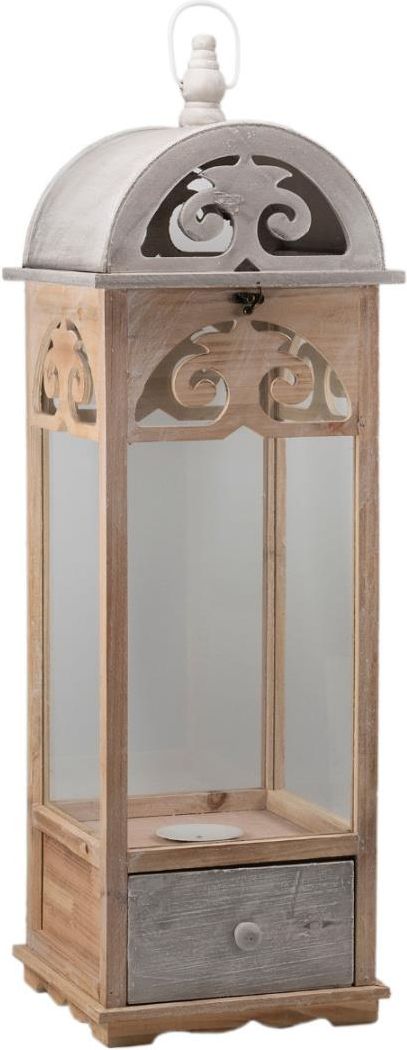 Duży, dekoracyjny lampion ze szklanymi szybkami. Latarnia wykonana została z drewna koloru brązowego przecieranego w stylu retro. Dopełnienia i uroku dodają latarni szklane szybki o grubości 3 mm. Wysokość lampionu 84 cm. We wnętrzu drewnianej konstrukcji umiejscowiona została metalowa podkładka o średnicy 7,5 cm, na którą można postawić świecę. Lampion otwiera się od góry, poprzez górne, szare wieczko, które zamykane jest metalowym haczykiem. Lampion w dolnej części został wyposażony w uroczą, drewnianą, szarą szufladkę z uchwytem, która może posłużyć nam do schowania drobiazgów, świec itp. Idealnie sprawdzi się on zarówno w pomieszczeniach, jak i na balkonach, tarasach czy ogrodach. Lampion posiada praktyczny uchwyt wykonany z metalu, dzięki któremu można go łatwo przenieść. Modny i klimatyczny lampion będzie ozdobą która umili Ci każdy wieczór. Wzór: szary rozmiar XL Produkt 1 x lampion Wymiary wysokość 84 cm szerokość 27 cm długość 27 cm Materiał drewno metal szkło Użytkowanie ozdoba wnętrza