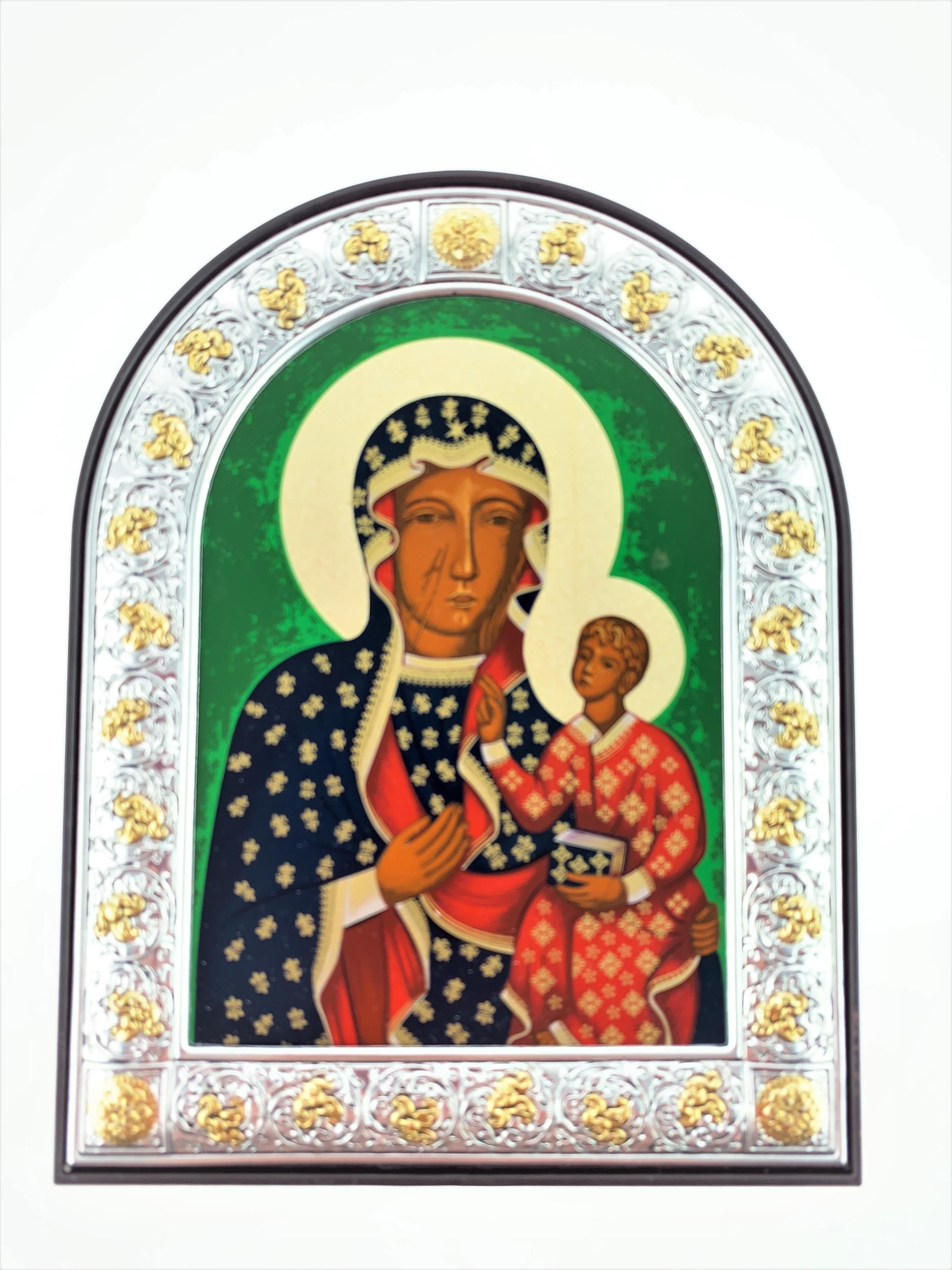 Replika ikony jasnogórskiej. Metalowa ramka została posrebrzona srebrem próby 925. Wymiary ikony: 12 x 15,5 cm