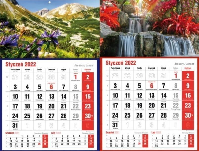 Kalendarz Jednodzielny pasuje wszędzie tam, gdzie na trójdzielny brakuje miejsca, a zależy nam na podglądzie poprzedniego i następnego miesiąca. Kalendaria zawierają oznaczenia miesięcy i dni tygodnia w trzech językach (PL, EN, DE) oraz imieniny i typowe święta. Format: 31x48 cm Uwaga: wysyłka wzoru losowa.