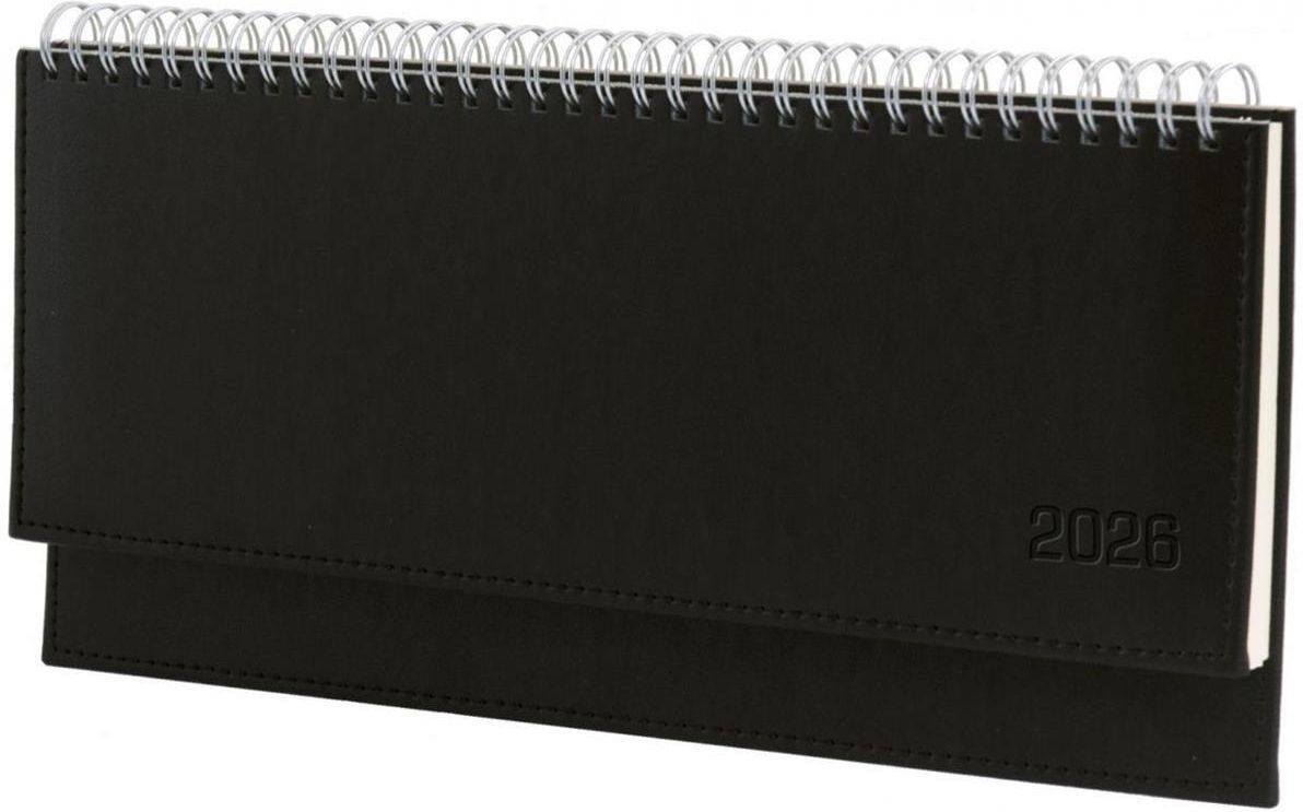 Kalendarz 2026 na biurko leżący WOKÓŁ NAS Vivella kol. czarny na spirali [KB047VB] Elegancki terminarz biurkowy w oprawie z wysokiej jakości Vivella, obszytej nićmi, co nadaje mu prestiżowy i trwały charakter. Posiada przejrzyste kalendarium w układzie tygodniowym z dodatkowym skróconym kalendarium trzech miesięcy na każdej stronie. Zaznaczone są w nim święta i daty imienin, co ułatwia codzienne planowanie. Drukowany w stonowanej kolorystyce szaro-bordowej na białym papierze o gramaturze 70 g/m². typ: terminarz biurkowy leżący układ: tygodniowy język kalendarium: PL papier: biały 70 g/m² kolor: czarny druk: szaro-bordowy format kalendarium: 296 x 102 mm format całkowity: 300 x 145 mm liczba stron: 122 dodatki: skrócone kalendarium, plan roku, święta, imieniny, dane astronomiczne, skorowidz teleadresowy oprawa: Vivella, obszywana nićmi brak stopki wydawniczej Format kalendarium to 296 x 102 mm, a cały kalendarz ma wymiary 300 x 145 mm. Zawiera 122 strony, obejmujące: kalendarium PL na 2026 rok, skrócone kalendarium na lata 2025, 2026 i 2027, plan roku 2026, wschody i zachody Słońca, fazy Księżyca, zestawienie długich weekendów 2026, dni wolne od pracy w wybranych krajach, alfabetyczny skorowidz teleadresowy.