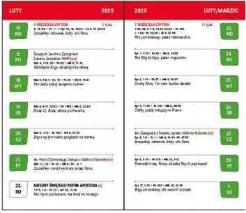 Szukasz kalendarza, który poprowadzi cię przez liturgię 2025 roku? Skorzystaj z kalendarza liturgicznego! To doskonała pomoc dla każdego, kto chce mieć szybki dostęp do liturgii na każdy dzień. Kalendarz liturgiczny zawiera: symbol wskazujący rangę liturgiczną danego dnia, odnośniki do liturgii słowa, refreny psalmów responsoryjnych, numerację tygodni Psałterza, oznaczenia kolorystyczne danego dnia liturgicznego, intencje Apostolstwa Modlitwy, miejsce na notatki. Dodatkowy atut kalendarza to jego niewielkie wymiary, dzięki którym możesz go zabrać wszędzie, gdzie potrzebujesz lub nosić go zawsze przy Piśmie Świętym.