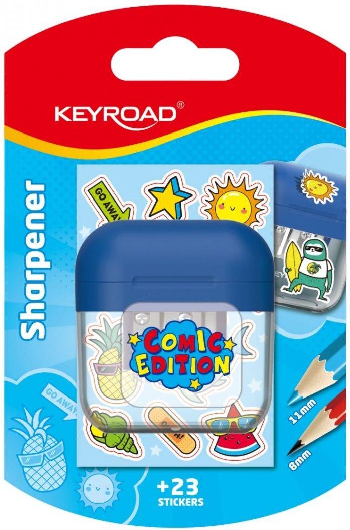 podwójna temperówka KEYROAD Comic Edition przeznaczona do ostrzenia ołówków i kredek o maksymalnej średnicy 8 lub 11mm transparentny pojemnik na ostrużyny w zestawie 23 naklejki z kreskówek do udekorowania przyborów szkolnych opakowanie: blister kolor: transparentny MIX kolorów - wysyłka losowa.