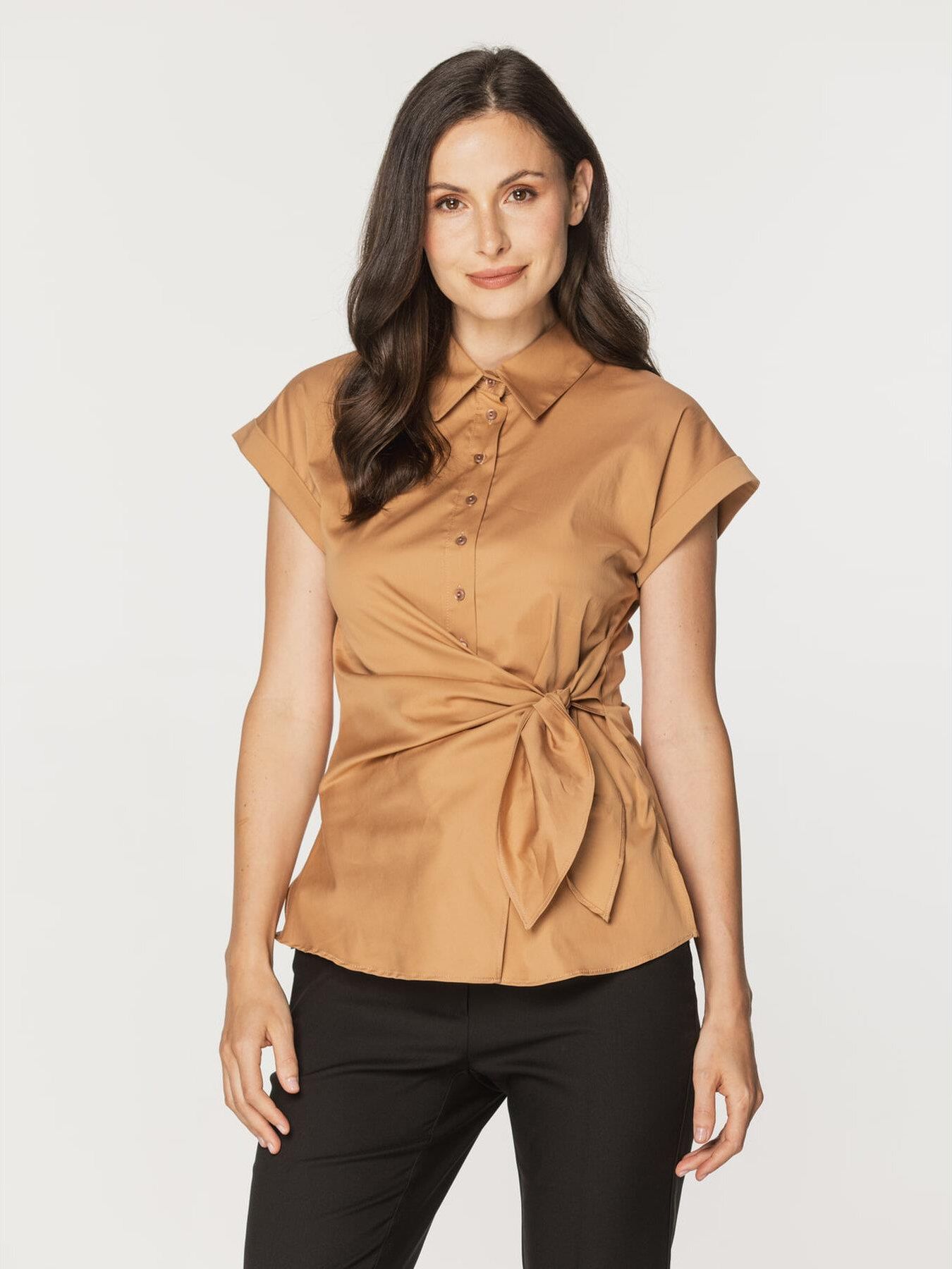 Camelowa koszula damska z krótkim rękawem, klasycznym kołnierzykiem i stylowym wiązaniem w talii