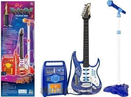 Niebieska gitara elektryczna z mikrofonem i wzmacniaczemZabawka z rockowym pazurem wykonana jest z wysokogatunkowego materiału w niebieskim odcieniu. Korpus gitarki ozdobiony jest ciekawą, graficzną naklejką oraz ośmioma guziczkami. Przyciski te służą między innymi do włączenia i wyłączenia gitary, a także zmiany piosenek i dźwięków gitary. Plastikowy model instrumentu wyposażony jest w metalowe, czułe na dotyk struny, przypominające te znajdujące się w prawdziwej gitarze. Dziewczęcy pasek dołączony do rockowej zabawki ułatwi małej gitarzystce występy — już nie musisz się martwić, że zabawka upadnie podczas zabawy. Co Twoja gwiazda znajdzie w zestawie? - gitarę, - 6 metalowych strun, - możliwość wyboru tonów, - dźwignię, - 6 melodii demo, - regulację tempa, - regulację głośności, - 4 migające światełka, - pasek, - mikrofon, - statyw, - wzmacniacz. Dołączony do kompletu statyw ułatwia zamontowanie mikrofonu przed dzieciakiem. W prosty sposób można regulować jego wysokość, która może osiągnąć od 65 cm do 109 cm. Zabawkowy mikrofon po podłączeniu do gitary przesyła wokal dziecka do wbudowanego głośnika, z którego następnie wybrzmiewa. Wzmacniacz, tak samo, jak gitara, ma wbudowaną regulację głośności, a także trzy różne porty: na mikrofon, gitarę i odtwarzacz MP3. Wymiary gitary 72 cm x 24 cm x 4 cm Wymiary pudełka 73 cm x 26 cm x 11 cm Dziecięca gitara zasilana jest 4 bateriami typu AA 1.5 V, które nie są dołączone do instrumentu. Przeznaczona jest dla wszystkich dzieci powyżej 6. roku życia. Wszelkie elementy zestawu posiadają certyfikat CE, świadczący o bezpieczeństwie płynącym z zabawy. Zabawka zapakowana jest w wielokolorowe, barwne pudełko. Informacje o produkcie Długość towaru w centymetrach 28 Ostrzeżenie! Nieodpowiednie dla dzieci w wieku poniżej 6 lat Płeć unisex Wiek 6 lat + Wysokość towaru w centymetrach 75 Szerokość towaru w centymetrach 13 Waga gabarytowa w gramach 4550