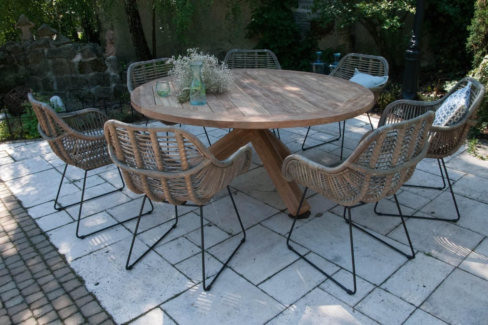 Meble ogrodowe BORDEAUX X Stół jest ważnym świadkiem wszystkich rodzinnych chwil – to przy nim świętujemy małe i duże sukcesy, celebrujemy ważne chwile i smakujemy życie z tymi, na których najbardziej nam zależy. Przy stole gromadzimy się, aby na chwilę zatrzymać się w codziennej bieganinie i cieszyć się towarzystwem najbliższych. Stół BORDEAUX TEAK może stać się centrum aranżacji stylowego salonu albo jadalni, które rozbłysną nowym blaskiem. Stół BORDEAUX TEAK – naturalne piękno Stół BORDEAUX TEAK harmonijnie łączy w sobie walory estetyczne i funkcjonalne. Rozłożysty, okrągły blat jest klasycznym i ponadczasowym elementem, który pasuje do wnętrza zaprojektowanego w każdej stylistyce. Lekkości drewnianej konstrukcji nadają oryginalne nogi, które przełamują surowy i prosty projekt. Całość wykonana jest z niezwykle trwałego budulca – drewna tekowego, dla którego środowiskiem naturalnym są azjatyckie lasy. Naturalna struktura drewna finezyjnie łączy się z projektami krzeseł i foteli z rattanu, tworząc kolekcję, dzięki której zapraszasz żywą naturę do swojego domu. Stół BORDEAUX TEAK dostępny jest w dwóch wersjach – średnicy 135 cm i 170 cm. Elementy zestawu BORDEAUX X: Stół BORDEAUX TEAK (Ø 135 cm x 75 cm) - drewno tekowe - 1 szt. Krzesło rattanowe retro LAVAL, kolor szary (65 cm x 58 cm x 88 cm) - naturalny indonezyjski rattan - 6 st. Producent: Vimine Natural Wicker Stół BORDEAUX - materiały: drewno tekowe z recyklingu blat: 4cm grubości nogi: 10/12cm grubości Konserwacja: drewno tekowe: Meble tekowe z kolekcji VIMINE wykonane zostały z drewna pochodzącego z recyklingu. W zależności od warunków pogodowych drewno teakowe będzie naturalnie kurczyć się i rozszerzać, co w dłuższej perspektywie czasu spowoduje tworzenie się naturalnie wyglądających niedoskonałości. Blaty stołów z drewna tekowego mogą mieć tendencję do spaczenia +/- 2cm. Z biegiem czasu srebrno-szary kolor będzie coraz bardziej widoczny. Drewno to naturalny materiał, który pod wpływem czynników zewnętrznych może zmieniać kolor i kształt. Produkt można impregnować lub malować na własną odpowiedzialność. Przechowywanie: wewnątrz, nie zaleca się przechowywania i użytkowania na zewnątrz gdy produkt jest narażony na bezpośrednie działanie wody Zaleca się przed pierwszym użytkowaniem olejowanie (2-3 krotne olejowanie olejem bezbarwnym do mebli ogrodowych) elementów drewnianych mebli, celem utrwalenia koloru drewna, odbarwiania się drewna oraz zapobiegnięciu powstawania plam na powierzchni drewna. Olejowanie może spowodować chwilową zmianę koloru drewna na bardziej intensywny i soczysty, z czasem drewno odzyskuje pierwotny kolor. Stylowe krzesło rattanowe retro LAVAL Jeśli wydaje Ci się, że krzesło to nudny, pozbawiony finezji mebel, to najwyższa pora, żebyś poznał naszą wyjątkową propozycję z rattanu – krzesło retro LAVAL. Nie potrzebujesz wymyślnych dodatków, żeby udekorować pomieszczenie. Finezyjny kształt nawiązujący do stylistyki dawnych lat jest ozdobą samą w sobie, dzięki której stylowo uzupełnisz każdą przestrzeń. Krzesło rattanowe retro LAVAL – zderzenie nowoczesności i tradycji Innowacyjny projekt krzesła łączy ze sobą dwie sprzeczności – tradycyjne wzornictwo w retro stylu, współgrające z naturalnym rattanem i surową, nowoczesną formę widoczną w metalowych nogach. Zestawienie geometrycznego chłodu i ciepłej w wyrazie plecionki zaowocowało nieoczywistym projektem, który idealnie trafia w gusta miłośników wysmakowanego designu. W parze z zachwycającym efektem wizualnym idzie funkcjonalność. Każde krzesło LAVAL wykonane jest ręcznie z rattanu uprawianego na ekologicznej plantacji, dzięki czemu każdy poszczególny model jest unikatowym egzemplarzem. Solidny stelaż z metalu wzbogacony o antypoślizgowe zaślepki gwarantuje stabilność i wytrzymałość konstrukcji. Dzieło wieńczy doskonale wyprofilowane, głębokie siedzisko, dające błogie uczucie komfortu i relaksu. Krzesło LAVAL - materiały: wykonanie z naturalnego rattanu pochodzącego z plantacji zrównoważonego rozwoju w Indonezji ręcznie wykonany stelaż metalowy o grubości 1 cm włókno rattanowe o grubości ok. 0,9 cm zaślepki antypoślizgowe maksymalny udźwig 110 kg Konserwacja: stelaż / plecionka: czyścić z kurzu suchą ściereczką, odkurzać miękką szczotką z włosiem lub miotełką do kurzu, okazjonalnie czyścić wodą z dodatkiem delikatnych środków czyszczących, nie wymaga żadnej konserwacji, nielakierowane elementy można zaimpregnować bezbarwnym sprayem Przechowywanie: wewnątrz, nie zaleca się przechowywania na zewnątrz budynków Zobacz kolekcję mebli z naturalnego rattanu i drewna teakowego marki VIMINE: https://youtu.be/r1g7