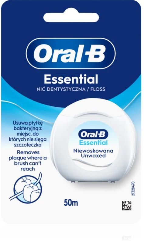 Oral-B Essential Floss Unwaxed, 50 m, Nici dentystyczne dla kobiet, Nić dentystyczna Oral-B Essential Floss Unwaxed jest ważnym uzupełnieniem higieny przestrzeni międzyzębowych. Pomaga w walce z bakteriami tam, gdzie nie dociera szczoteczka do zębów. Właściwości: usuwa osad nazębny pod linią dziąseł gwarantuje delikatną pielęgnację dziąseł usuwa resztki jedzenia łatwo ślizga się między zębami Sposób użycia: Używaj po zwykłym wyczyszczeniu zębów, aby doczyścić przestrzenie międzyzębowe albo po jedzeniu, aby usunąć resztki jedzenia spomiędzy zębów.