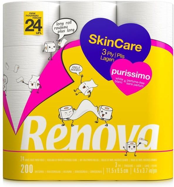 Papier toaletowy Renova Skin Care Purissimo 24R Renova Papier toaletowy Renova Skin Care Purissimo 24 rolki Nowy wymiar komfortu, na jaki zasługuje Twoja skóra. 200 trójwarstwowych arkuszy dobrego samopoczucia w najczystszej formie, w sumie imponujące 23 metry rolki! Pielęgnacja skóry Purissimo …