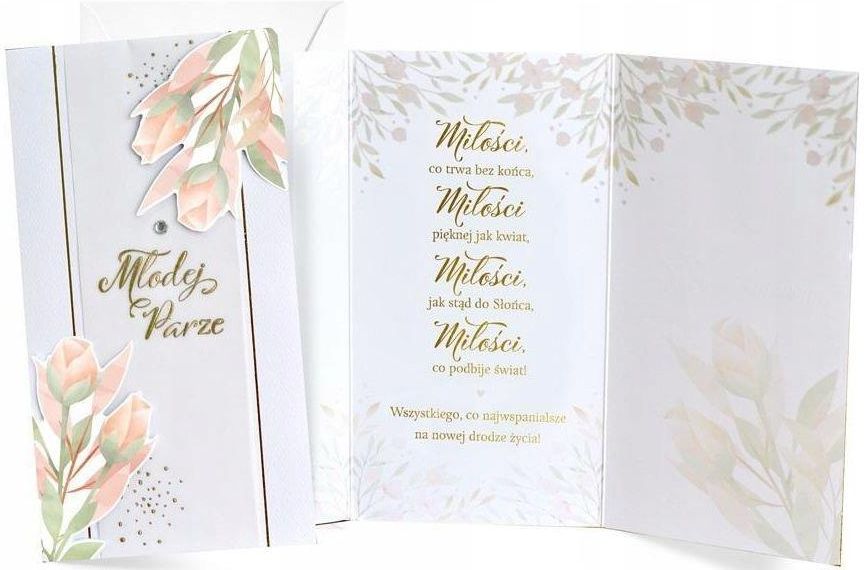 Karnet Ślub Karnet Ślub Każda kartka w kolekcji Passion Moments to małe arcydzieło - wyjątkowe i niepowtarzalne, piękne wizualnie. Kartki PM są bardzo bogato zdobione, a jednocześnie skromne i stylowe, cały efekt tkwi w detalach i doskonałym wykonaniu. W zależności od wzoru, na kartkach znajdują się dekoracje ze złotej, srebrnej, perłowej lub holograficznej folii, a także doklejki biżuteryjne, kokardki, brokat, laserowe wycięcia, wstążeczki i inne dodatki. Wnętrze karnetu to zawsze atrakcyjna grafika i tekst życzeń. Kartki mają w komplecie dopasowaną kopertę. Cechy szczególne: zdobienie: przynajmniej dwie folie (metaliczne/perłowe/holograficzne), elementy doklejane, wycięcia laserowe, wstążeczki - w zależności od wzoru, wnętrze: z delikatną grafiką, wyjątkowe życzenia w środku, w komplecie: dopasowana kolorystycznie koperta, okazja: Ślub Wymiary karnetu po złożeniu: 11,4 x 21,5 cm. Karnet Ślub OKAZJA! Spradź inne nasze ofety!