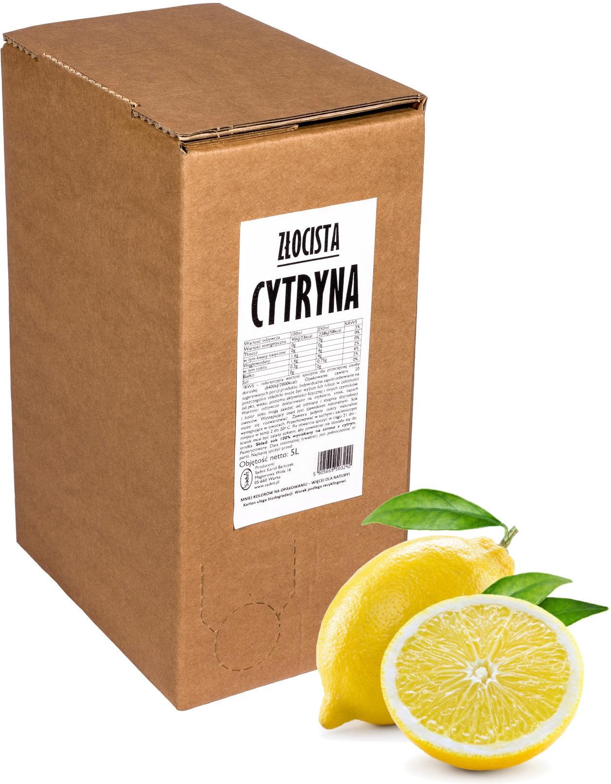 SOK 100% CYTRYNA SOKARNIA PODLASKA 5L Świeży sok 100% cytryna to idealny napój nie tylko na lato, ale również na zimę, zawsze wtedy, kiedy potrzeba orzeźwienia i energii, a także wsparcia organizmu. Działa jako silny antyoksydant, neutralizując wolne rodniki i chroniąc komórki przed stresem oksydacyjnym. Sok wspiera trawienie, stymulując produkcję enzymów trawiennych i poprawiając funkcjonowanie układu pokarmowego. Dodatkowo, sok cytrynowy jest często używany w kuchni do aromatyzowania potraw, przygotowywania napojów, marynat i sosów. Lekki, orzeźwiający i energetyzujący smak Pomaga w walce z infekcjami i przeziębieniami - dzięki dużej zawartości witaminy C Oczyszcza organizm Pozwala zachować równowagę kwasowo-zasadową organizmu Dlaczego warto pić sok z cytryn? Wzmacnia układ odpornościowy - sok z cytryny jest bogaty w witaminę C, która wzmacnia układ odpornościowy, pomagając organizmowi zwalczać infekcje i choroby. Wspiera trawienie i wspomaga utratę wagi - sok może stymulować produkcję soków żołądkowych, co wspomaga trawienie i zapobiega problemom trawiennym, takim jak wzdęcia i niestrawność. Zawiera też pektyny, które pomagają w kontrolowaniu apetytu i wspomagają metabolizm. Poprawia zdrowie skóry - sok z cytryn pomaga w produkcji kolagenu, co poprawia elastyczność skóry i może zmniejszać widoczność zmarszczek oraz blizn. Pozytywny wpływ na zdrowie serca - regularne spożywanie soku może pomóc w obniżeniu poziomu cholesterolu i ciśnienia krwi, co wspiera zdrowie serca. Picie soku z cytryn ma pozytywny wpływ na zdrowie Cytryna zawiera sporo (ale wbrew pozorom nie najwięcej!) witaminy C, odpowiedzialnej za wspieranie odporności organizmu i łagodzenie infekcji. Rutyna zawarta w cytrynach pomaga uszczelniać naczynia krwionośne, odpowiada za prawidłowe wchłanianie witaminy C i zapobiega jej utracie. Oprócz tego posiada właściwości detoksykujące, oczyszcza wątrobę, stymuluje wydzielanie żółci, a poprzez działanie moczopędne pomaga wypłukiwać toksyny z nerek. Cytryny zawierają przeciwutleniacze, witaminy z gruby B i E oraz minerały, takie jak potas, magnes, sód i żelazo, niezbędne do prawidłowego funkcjonowania narządów, pracy układów oraz regeneracji komórek. Sok z cytryny ma właściwości antybakteryjne, które mogą pomóc w zwalczaniu bakterii powodujących nieświeży oddech. Specyfikacja produktu Nazwa żywności: Sok 100% cytryny. Ilość netto: 5 L. Kraj pochodzenia: Hiszpania. Data minimalnej trwałości: 4 miesiące. Warunki przechowywania: Przechowywać w chłodnym i zacienionym miejscu. Po otwarciu spożyć w ciągu 14 dni. Najlepiej spożyć przed: data na opakowaniu. Wykaz składników: cytryny (100,0%). Sok pasteryzowany. SOK TŁOCZONY, NATURALNIE MĘTNY Mętność i osad na dnie są zjawiskiem naturalnym. Smak i barwa soku może się nieznacznie różnić w zależności od pory roku i użytych odmian surowca. Wartość odżywcza w 100g Wartość energetyczna: 46 kJ, 11 kcal / RWS: 1,0% Tłuszcz: <0,5 g /RWS 0,1%, w tym kwasy tłuszczowe nasycone: <0,1 g / RWS: 0,1% Węglowodany: 1,3g/ RWS: 0,5% , w tym cukry: 1,3g / RWS: 1,5% Błonnik: 1,7 g / RWS: 6,7% Białko: <0,5g / RWS: 0,7% Sól: RWS: 0,1% *RWS - Referencyjna wartość spożycia dla przeciętnej osoby dorosłej (8400 kJ/2000 kcal) Sok występuje w woreczku typu bag in box z kranikiem, zapakowany w karton kolorowy lub biały. Sadownictwem zajmujemy się od pokoleń. Sadownikiem był mój Dziadek, Ojciec, a teraz także i ja. Sadownik to nie zawód, to przede wszystkim pasja. Pasja produkowania najwyższej jakości owoców, z których powstają naturalne soki tłoczone. Nasze gospodarstwo położone jest na wschodzie Polski, na Południowym Podlasiu. Pośród dziewiczej przyrody, w pobliżu Parku Krajobrazowego Podlaski Przełom Bugu, rosną nasze sady. Podlaskie słońce, czyste nadbużańskie powietrze, wciąż dzika przyroda Polski wschodniej, sprawiają, że nasze owoce są naturalne, nieskażone cywilizacją. Radością jaką czerpiemy z produkowania owoców, a także ich niepowtarzalnym smakiem, chcemy podzielić się z Państwem. Nasze soki produkujemy z wyselekcjonowanych owoców i warzyw. Nie dodajemy do nich cukru, wody, ani konserwantów. Małgorzata i Piotr Stefaniukowie Sokarnia Podlaska