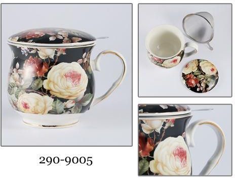 Komplet idealny do zaparzania ziół/herbaty składający się z kubka Roses(róże) z przykrywką i metalowym sitkiem/zaparzaczem z kwiatowym motywem i z naniesionymi delikatnymi złoceniami obrzeży. Kubek wchodzi w skład kolekcji dekoracyjnej porcelany stołowej "English Collection", której design tworzony jest na Wyspach Brytyjskich.Produkt firmowany przez P4Y - globalną, chińską marką pod którą sprzedawana jest biała i dekoracyjna porcelana stołowa oraz porcelanowe i z żywicy syntetycznej/konglomeratu figurki, m.in. tworzone według grafik cenionej angielskiej artystki Diane Melville Kaye(Di Kaye).Podstawowa specyfikacja: wysokość kubka = około 10,5cm pojemność kubka = około 480ml rodzaj porcelany: średniej grubości, kostna, biała i połyskująca, dobrej jakości motyw: trwale naniesiony, nieusuwalny, ze złoceniami użytkowanie: z powodu złoceń sugerujemy mycie ręczne opakowanie: kartonowe