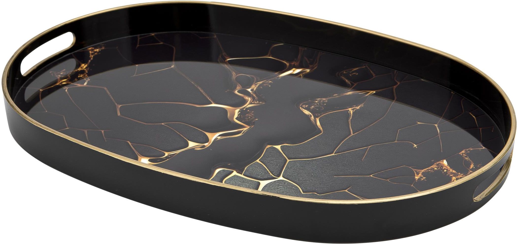 Piękna taca dekoracyjna z tworzywa sztucznego. Perfekcyjnie zdobiona modnym wzorem. Wytworzona z dbałością o szczegóły. Niezwykle dostojna kompozycja, której uroku dodają charakterystyczne złote uchwyty i obrzeże. Taca udekoruje nie tylko stół, ale także komody, przeszklone witryny czy półki …