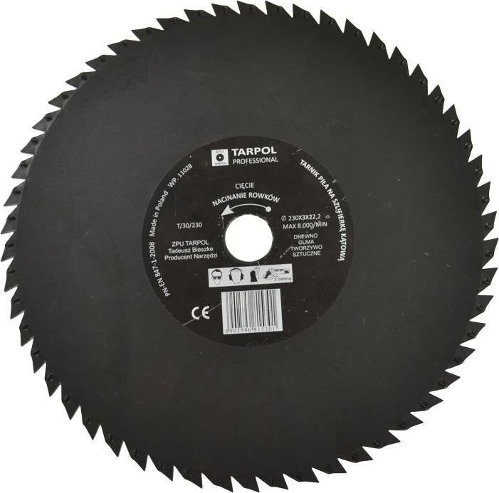 Tarnik piła do szlifierek kątowych 230 mm, TARPOL [T-30]: tarnik - piła do prac w drewnie, tworzywach sztucznych, gumie, przeznaczony do cięcia, frezowania, nacinania rowków, dopasowywania elementów, przy pomocy tarnika T-30 można np. tworzyć w miękkich ścianach zarysy do prac instalacyjnych (np. przy prowadzeniu kabli, czy rur instalacyjnych), tarnik przeznaczony jest do szlifierek kątowych elektrycznymi i akumulatorowymi, maksymalna prędkość obrotowa: 8000 obr./min. Parametry tarnika TARPOL [T-30] średnica tarczy:230 mm, średnica otworu:22,2 mm, grubość tarczy:3 mm, maksymalna prędkość obrotowa: 8000 obr./min., certyfikat bezpieczeństwa: B, gwarancja: - 12 miesięcy w przypadku zakupu na fakturę, - 24 miesiące w przypadku zakupu na paragon, instrukcja obsługi Przed przystąpieniem do pracy z narzędziami firmy ZPU TARPOL należy zapoznać się z instrukcją obsługi tarników. Podczas pracy tarczą konieczne jest stosowanie środków ochrony osobistej, takich jak: ubranie ochronne, gogle, maska przeciwpyłowa i rękawice ochronne. W żadnym przypadku nie wolno przekraczać maksymalnej dopuszczalnej prędkości obrotowej tarczy. Nie wolno obrabiać materiałów innych niż te, które zostały wymienione w instrukcji.