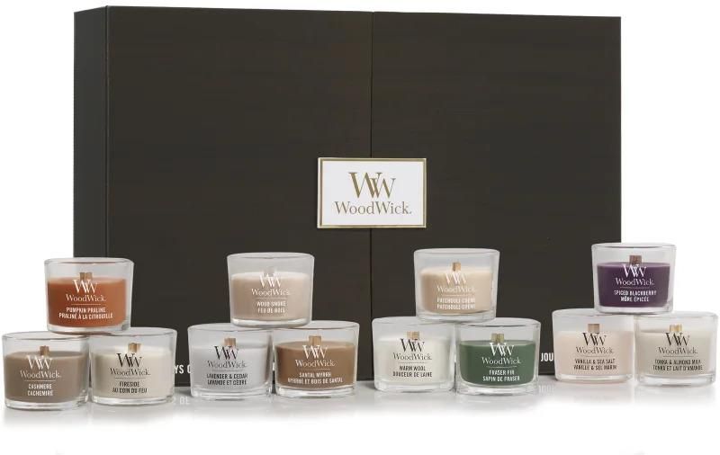 Woodwick Gift Box, , Świece wotywne Zapachy do domu, Właściwości: podczas palenia przyjemnie trzaska, tworząc przytulną atmosferę czyste spalanie Zawartość zestawu: Fireside sampler świeca 106 g Fraser Fir sampler świeca 106 g Wood Smoke sampler świeca 106 g Spiced Blackberry sampler świeca 106 g Pumpkin Praline sampler świeca 106 g Lavender & Cedar sampler świeca 106 g Santal Myrrh sampler świeca 106 g Vanilla & Sea Salt sampler świeca 106 g Cashmere sampler świeca 106 g Patchouli Crème sampler świeca 106 g Warm Wool sampler świeca 106 g Tonka & Almond Milk sampler świeca 106 g