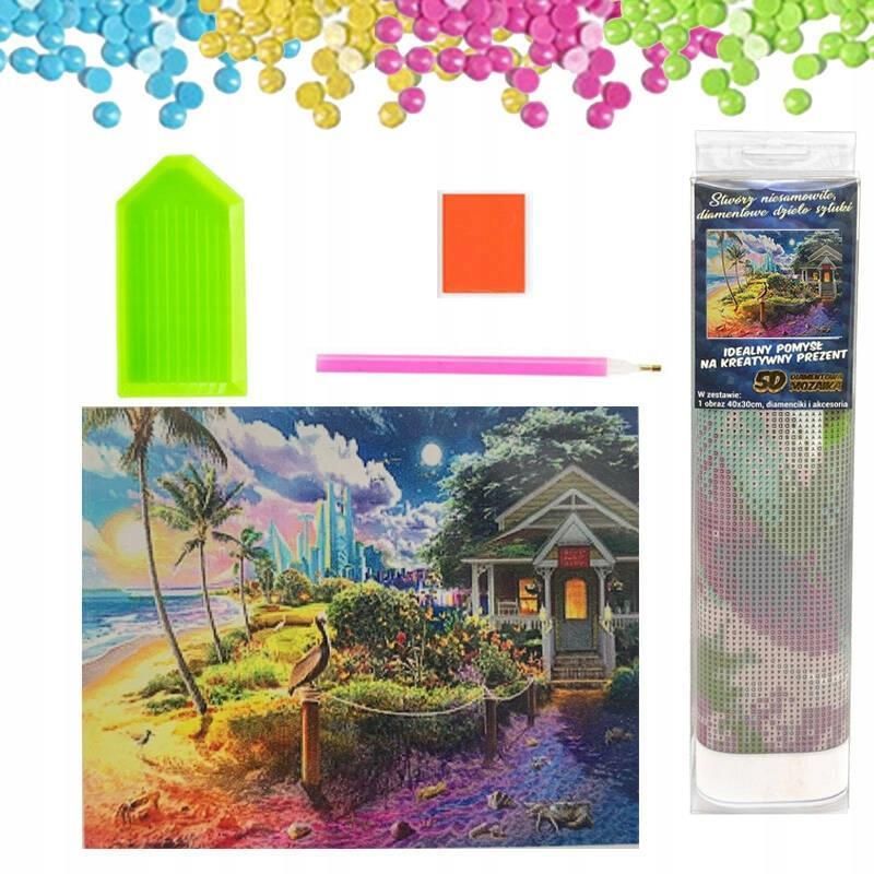 DIAMENTOWA MOZAIKA HAFT DIAMENTOWY DOM NA PLAŻY 30X40CM Mozaika 5D to rewelacyjna zabawa dla dzieci! Diamentowa mozaika to idealne zajęcie na spędzenie wolnego czasu. Aby powstał obrazek przyklej diamenciki za pomocą aplikatora na płótno pokryte specjalnym woskiem. Jest to długotrwała praca, która nie wymaga żadnych specjalnych umiejętności, a jedynie cierpliwości i dokładności. To ciekawy pomysł na spędzenie wolnego czasu, który może przerodzić się w nowe, niezwykłe hobby. Działania artystyczne, zwłaszcza malarstwo diamentowe, mają ogromny wpływ na kreatywność i wyobraźnię. Mozaika diamentowa wymaga dużej koncentracji, precyzji i cierpliwości. To sposób na skupienie myśli właśnie na tej aktywności, dzięki czemu możesz oderwać się od stresu. Efekt końcowy jest imponujący nie tylko dla osoby, która zajmowała się malowaniem diamentów, ale także dla wszystkich, którzy widzą taki obraz. Diamenty mienią się delikatnie i robią niesamowite wrażenie. Gotowy obraz można oprawić. Haft diamentowy lub mozaika diamentowa, to akrylowe diamenciki o pięknych kolorach, które nakleja się według wzoru na tkaninie, tworząc olśniewającą diamentową mozaikę. Haft diamentowy to świetny sposób na odpoczynek i relaks. Wprawia w radosny nastrój, pobudza nasz umysł i rozwija zdolności manualne. Diamentowy obraz może być wspaniałym prezentem. Wspaniałe kolory, ciekawe wzory o różnorodnej tematyce i wysokiej jakości akcesoria zadowolą nawet nawet najbardziej wymagających pasjonatów tej pięknej techniki. Zestaw zawiera: ⭐ płótno z nadrukowanym wzorem oraz pokrytym specjalną warstwą klejącą diamenciki niezbędne do wykonania obrazu, które są posegregowane kolorami w ponumerowanych i oznaczonych symbolami woreczkach aplikator umożliwiający nakładanie diamencików na płótno plastikowy pojemnik do przechowywania diamencików suchy klej Instrukcja użytkowania: ⭐ Przygotuj stanowisko do pracy i rozpakuj zestaw. Przed użyciem płótno należy wyprostować (np. przy użyciu książek) Całe płótno pokryte jest warstwą kleju, który umożliwia przyklejanie diamencików. Odklej folię ochronną tylko z tego fragmentu płótna, który akurat będziesz wypełniać diamencikami. Stopniowo odklejaj folię ochronną z kolejnych fragmentów. Dzięki temu reszta warstwy klejącej nie wyschnie. Znajdź diamenciki, które chcesz użyć, wsyp je do dołączonego pojemniczka. Zanurz aplikator w poduszeczce z klejem i podnieś diamencik za pomocą aplikatora. Umieść diamencik na płótnie w odpowiednim miejscu. Wymiary obrazka bez białej ramki 25 x 35 cm.