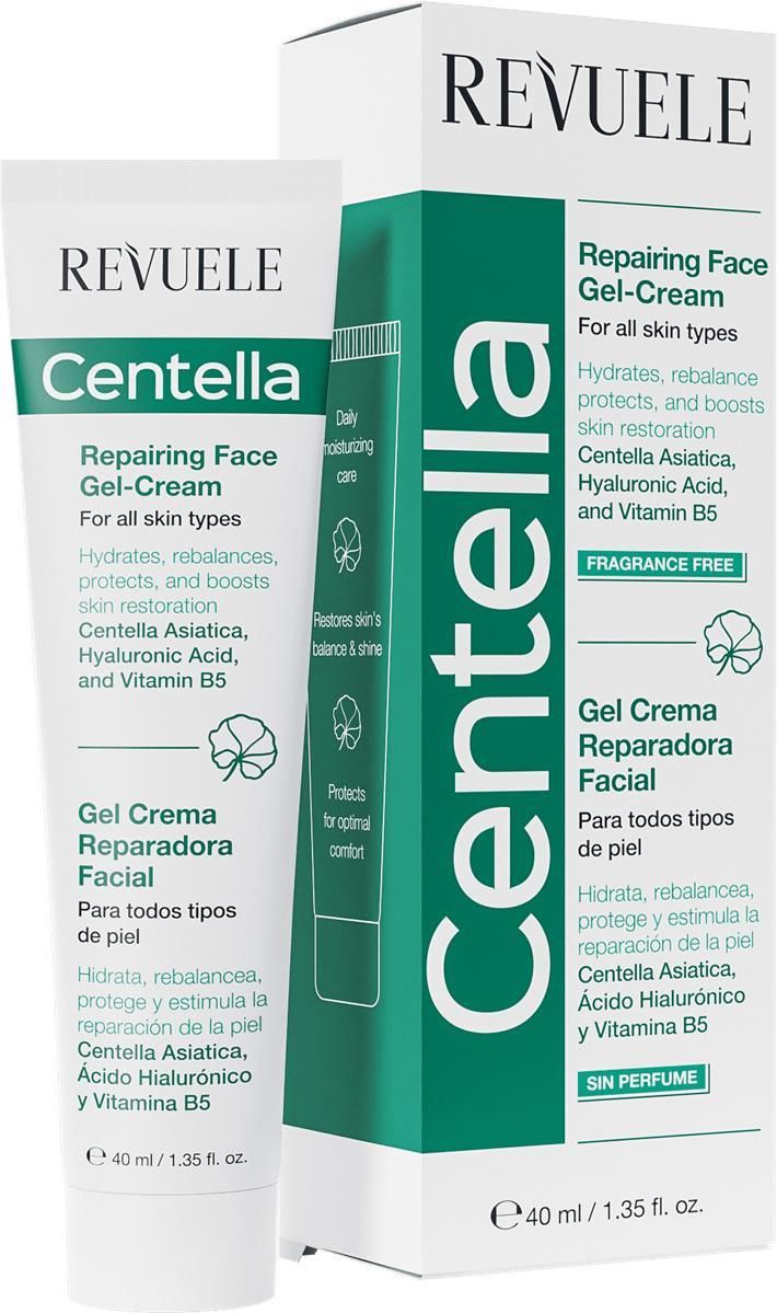 REVUELE CENTELLA REGENERUJĄCY ŻEL-KREM DO TWARZY to ultralekka, przywracająca równowagę codzienna pielęgnacja twarzy dla każdego rodzaju cery z poszarzałą cerą, oznakami zmęczenia i drobnymi zmarszczkami. Wielofunkcyjna formuła z CICA (Centella Asiatica), Kwasem Hialuronowym i Witaminą B5 natychmiast nawilża skórę i działa przez cały dzień, chroniąc i wspomagając jej regenerację. Pomaga przywrócić równowagę i elastyczność skóry, pozostawiając ją jędrniejszą, zdrowszą i młodszą. Sposób użycia: Nakładać rano i/lub wieczorem na oczyszczoną skórę twarzy i szyi masującymi ruchami aż do całkowitego wchłonięcia. Dla uzyskania najlepszych efektów stosuj razem z REGENERUJĄCYM SERUM DO TWARZY REVUELE CENTELLA. Uwaga: Możliwa jest indywidualna nietolerancja któregokolwiek ze składników. Przed pierwszym użyciem zaleca się wykonanie testu wrażliwości. Unikać kontaktu z oczami. W przypadku kontaktu z oczami natychmiast przemyć wodą.