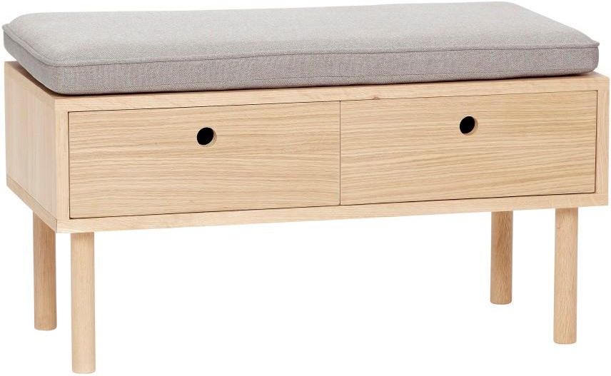 Projektanci marki Hübsch skupiają się przede wszystkim na kolorach i użytych materiałach. Dzięki temu ich katalogi został starannie uzupełnione o produkty najlepszej jakości, które rozwijają najnowsze trendy w niezwykle kreatywne sposoby. Spojrzenia przykuwa przede wszystkim modna i minimalistyczna ławka, która prezentuje się niezwykle lekko. Dodaje wnętrzu wrażenia przestronności dzięki swoim skromnym, wysokim nogom i jasnym kolorom. Dębowa ławka jest solidna i całkiem wygodna dzięki szarej miękkiej podusze. Drewniany mebel został także wyposażony w półkę na podręczne przedmioty, idealną do przechowywania koców czy czasopism. Ławka będzie idealna do korytarza czy do wejścia, a postawiona w salonie z powodzeniem zastąpi fotel czy kanapę. Długość: 60 cm.