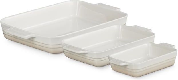 Zestaw trzech prostokątnych naczyń marki Le Creuset zawiera formy w rozmiarach 19, 26, 32 cm. Świetnie sprawdzą się one do codziennego użytku.