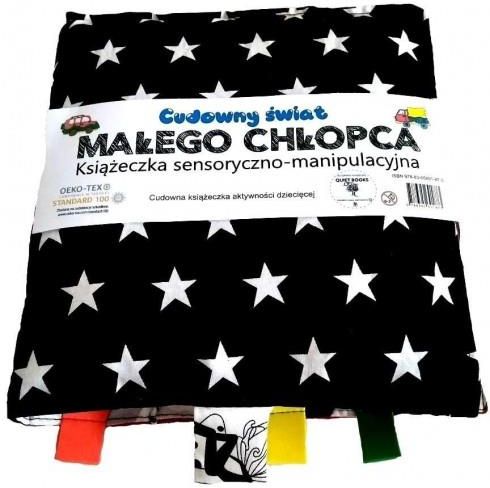 Książeczka Sensoryczna Cudowny świat chłopca   Książka stanowi doskonalą pomoc manualną dla dzieci, otwiera umysł na nowe możliwości, interaktywne zabawy pobudzają do działania, zetknięcie z różnymi fakturami oraz specjalnie dobrane ćwiczenia sprawiają, że dziecko aktywnie uczestniczy, skupia się i działa. Doskonałe połączenie zabawy, edukacji, rozwoju. Książeczka materiałowa wykonana z bawełny z certyfikatem Oeko Tex Standard 100, z użyciem materiałów certyfikowanych typu filc, pianka, sznurki, tasiemki. Książka z rodzaju ciche, sensoryczne, manipulacyjne, dotykowe.