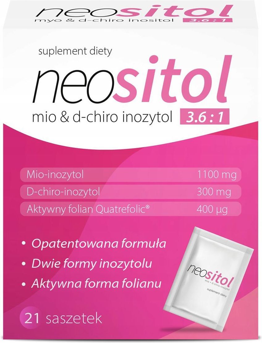 Neositol Suplement Diety, 21 saszetek Suplement diety neositol to połączenie dwóch form inozytolu: mio-inozytolu oraz d-chiro-inozytolu w proporcji 3.6:1 (Caronositol Fertility®) z dodatkiem aktywnego folianu IV generacji Quatrefolic®. Caronositol Fertility® to opatentowane połączenie mio-inozytolu i d-chiro-inozytolu (w stosunku 3,6:1), badane pod kątem jego wpływu na płodność u kobiet z problemami z zajściem w ciążę związanymi z zespołem policystycznych jajników (PCOS). Badania kliniczne wskazują, że poprawia ona wskaźniki zajścia w ciążę i zmniejsza ryzyko wystąpienia zespołu hiperstymulacji jajników (OHSS) u kobiet z PCOS, a także poprawia jakość cytoplazmy oocytów u kobiet z PCOS, ponieważ wykazano, że jest skuteczna w regulacji cykli menstruacyjnych i poprawie insulinooporności. Quatrefolic® to aktywny folian IV generacji zapewniający najwyższą biodostępność. Kwas foliowy odgrywa kluczową rolę w wielu procesach organizmu, jednak przyswajanie jego syntetycznej wersji może być utrudnione. Quatrefolic® został stworzony z myślą o maksymalnej biodostępności, gwarantując lepsze wchłanianie w porównaniu z tradycyjnym kwasem foliowym. Badania wykazują, że ponad połowa kobiet w Polsce ma trudności z metabolizowaniem kwasu foliowego, co przekłada się na ograniczoną jego przyswajalność. Dlatego też suplementacja folianami w postaci biodostępnej, jak Quatrefolic®, stanowi skuteczne rozwiązanie. Bez dodatku konserwantów oraz sztucznych aromatów. Opatentowane połączenie mio-inozytolu oraz d-chiro-inozytolu w stosunku 3.6:1 Dodatek aktywnego folianu 4 generacji Quatrefolic® Skuteczność potwierdzona badaniami klinicznymi Zawarty w preparacie Caronositol Fertility® uzyskał w badaniu klinicznym znakomite wyniki w porównaniu z proporcją mio- oraz d-chiro-inozytolu w stosunku 40:1. Porcja dzienna (1 saszetka) zawiera Mio-inozytol (1100 mg), D-chiro-inozytol (300 mg), Aktywny folian Quatrefolic (400 μg) Składniki inulina, mio-inozytol, d-chiro-inozytol (Caronositol Fertility®**), glukozamina 5 MTHF (Quatrefolic®). **Caronositol Fertility jest zastrzeżonym znakiem firmy Biosearch Stosowanie Zawartość jednej saszetki, rozpuścić w 200 ml wody. Spożyć bezpośrednio po przygotowaniu. Opakowanie Opakowanie zawiera 21 saszetek. Ważne Nie należy przekraczać zalecanej dziennej porcji do spożycia. Suplement diety nie może być stosowany jako substytut (zamiennik) zróżnicowanej diety. Zalecany jest urozmaicony sposób żywienia oraz zdrowy tryb życia. Nie stosować przy nadwrażliwości na składniki preparatu. Przechowywać w szczelnie zamkniętym opakowaniu w temperaturze pokojowej, w sposób niedostępny dla małych dzieci. Chronić przed światłem i wilgocią. Najlepiej spożyć przed końcem: data ważności i numer serii - na spodzie opakowania. Masa netto: 105 g Numer partii oraz data spożycia podana na opakowaniu Producent: Medimes Sp. z o. o., Polska Wszystko dla par starających się o dziecko. Zastanawiasz się, jak szybko i łatwo zajść w ciążę? Być może borykasz się z trudnościami w zajściu w ciążę lub niepłodnością? Na szczęście istnieje wiele dostępnych rozwiązań, takich jak produkty dedykowane zarówno kobietom, jak i mężczyznom, którzy planują powiększenie rodziny. Trzymamy kciuki za pozytywny wynik! Powodzenia w Twojej drodze do rodzicielstwa.