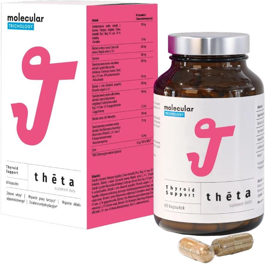 Molecular Trichology Theta Thyroid Support Kapsułki, 60 szt.Suplement diety wspierający tarczycę, odporność i kondycję włosówTheta Thyroid Support to zaawansowana formuła inspirowana tradycjami chińskimi, tybetańskimi i ajurwedą, stworzona z myślą o wsparciu organizmu w codziennej równowadze hormonalnej oraz w utrzymaniu zdrowych włosów i skóry głowy.Właściwości suplementu:Wspiera prawidłową pracę tarczycy i równowagę hormonalnąPomaga zachować kondycję włosów i skóry głowyZawiera składniki adapt