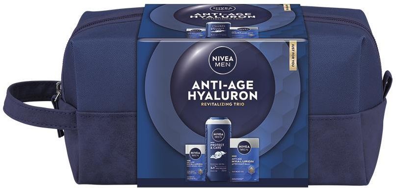 NIVEA MEN Anti-Age Hyaluron, , Zestawy kosmetyków dla mężczyzn, Wybierz zestaw kosmetyków i spraw radość sobie lub swoim bliskim NIVEA MEN. Zawartość zestawu: NIVEA MEN Protect & Care żel pod prysznic 500 ml NIVEA MEN Hyaluron balsam po goleniu 100 ml NIVEA MEN Hyaluron krem nawilżający przeciw zmarszczkom 50 ml Właściwości: kompleksowa pielęgnacja do codziennego stosowania produkt zapewniający głębokie odżywienie i nawilżenie do kompleksowej pielęgnacji skóry doskonały pomysł na prezent sprawi radość każdemu mężczyźnie Sposób użycia: Stosuj każdy z produktów z zestawu zgodnie z załączoną do niego instrukcją.
