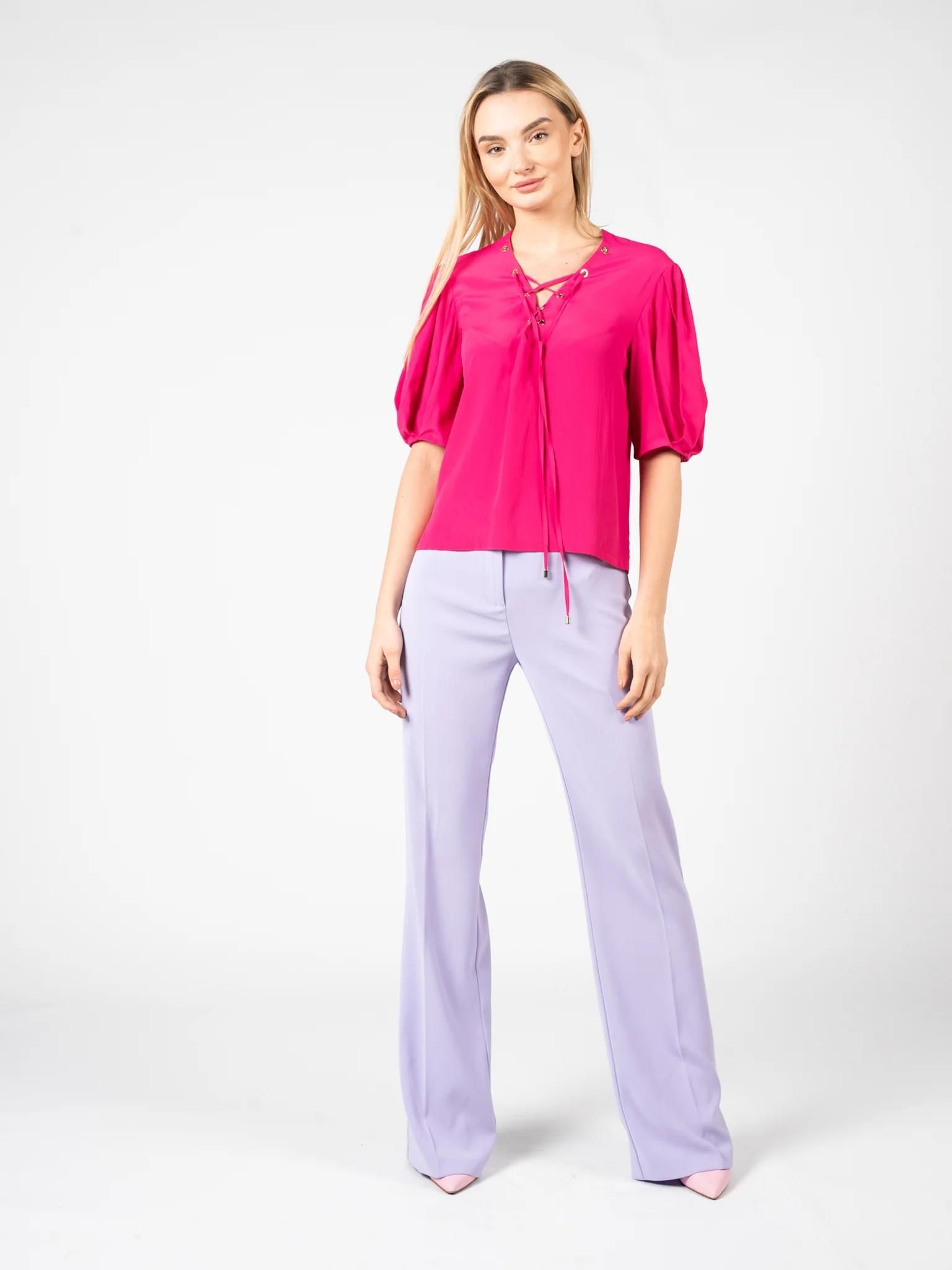 Ten klasyczny krój będzie pasował do każdej sylwetki, nadając elegancki, ale zarazem swobodny wygląd. Dekolt V-neck to ponadczasowy element, który pięknie podkreśla szyję i nadaje subtelny akcent kobiecości każdej stylizacji. Przy dekolcie ozdobne wiązanie dodaje uroku i indywidualnego charakteru, umożliwiając regulację głębokości dekoltu według własnych preferencji. Delikatnie bufiaste rękawy to modny akcent, który wprowadza do stylizacji nutę romantyzmu i delikatności, jednocześnie zachowując wygodę noszenia. Wykonana z wysokiej jakości tkaniny z dodatkiem jedwabiu, co gwarantuje nie tylko luksusowy wygląd, ale również wyjątkową miękkość i komfort noszenia na co dzień.