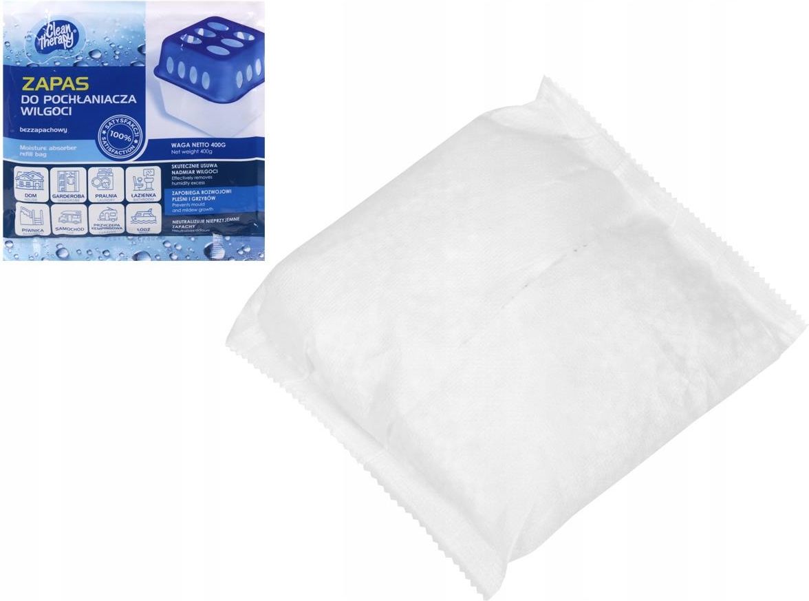 MOCNY Pochłaniacz wilgoci - wkład osuszacz 400g Zapas UNIWERSALNY Efektywna redukcja wilgoci w każdej przestrzeni Uniwersalny wkład do pochłaniacza wilgoci to niezastąpione narzędzie w walce z nadmiarem wilgoci. Zapobiega powstawaniu pleśni, grzybów oraz nieprzyjemnych zapachów tworząc zdrowsze i bardziej komfortowe warunki w Twoim otoczeniu. Wysoka wydajność i długotrwałe działanie Wkład o wadze skutecznie pochłania dużą ilość wilgoci, osuszając przestrzeń do. Zapewnia długotrwałe działanie, utrzymując odpowiedni poziom wilgotności w pomieszczeniach takich jak łazienki, piwnice czy samochody. Prosty i szybki montaż Instalacja wkładu jest niezwykle łatwa – wystarczy umieścić go w pochłaniaczu i gotowe! Regularna kontrola pozwala na jego terminową wymianę, co gwarantuje ciągłą efektywność urządzenia i ochronę przed wilgocią. Zastosowanie w różnych miejscach Dom: Idealny do sypialni, łazienek, kuchni i piwnic. Biuro: Tworzy komfortowe warunki pracy i chroni sprzęt biurowy. Samochód: Redukuje wilgoć wewnątrz pojazdu, zapobiegając zaparowaniu szyb i rozwojowi pleśni. Dlaczego warto wybrać nasz uniwersalny wkład? Skuteczność: Doskonała absorpcja wilgoci w pomieszczeniach do 20 m³. Uniwersalność: Kompatybilny z wieloma popularnymi pochłaniaczami wilgoci. Łatwość użytkowania: Szybka instalacja i wygodne użytkowanie. Długi czas działania: Wkład wystarcza na około 3 miesiące użytkownia! Postaw na uniwersalny wkład – Twoje wsparcie w walce z wilgocią! Zadbaj o zdrowie i komfort swojej przestrzeni już teraz, wybierając produkt, który łączy skuteczność, wygodę i uniwersalność.