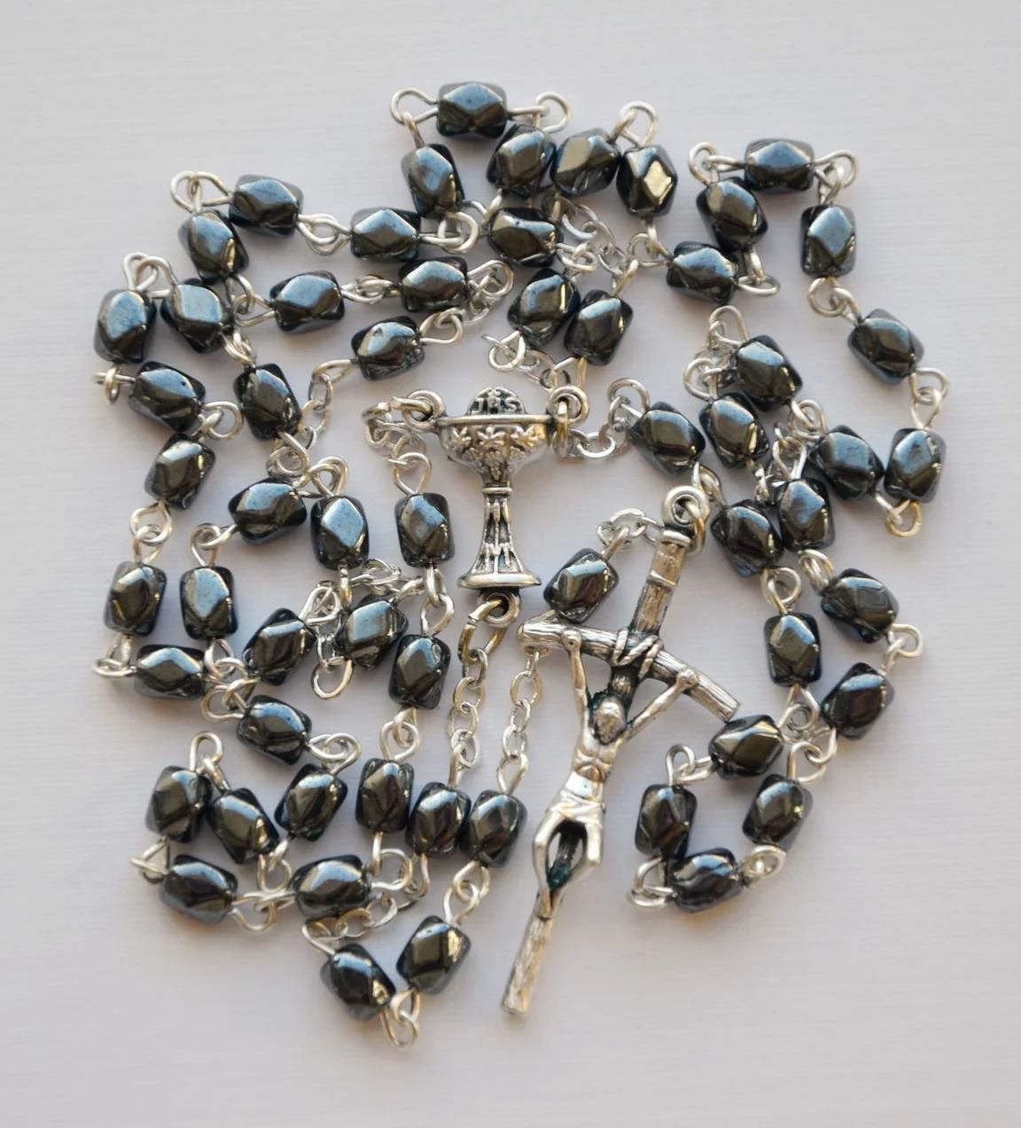 Różaniec grafitowy Różaniec z paciorkami w kształcie kostek, w grafitowym odcieniu, z efektem mieniącej się perły. Poszczególne koraliki połączone są drutem, a każdy z nich ma średnicę ok. 5 mm. Całości dopełnia piękny krzyżyk. Długość 46 cm. Różaniec idealnie nadaje się jako prezent na Pierwszą Komunię Świętą.