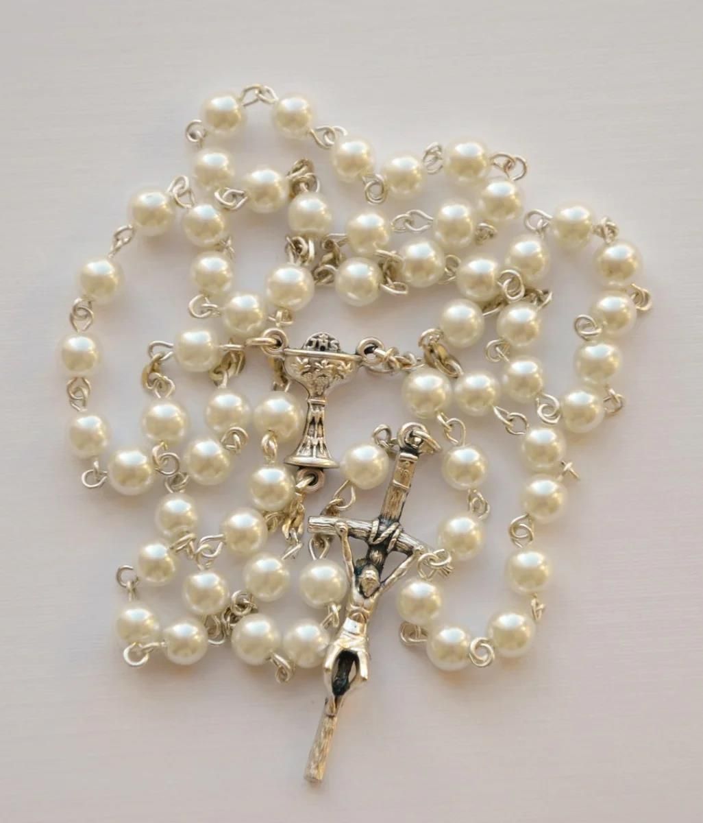 Różaniec komunijny to wspaniała pamiątka przyjęcia przez dziecko sakramentu. Wykonany z perłowych paciorków połączonych srebrnymi ogniwami i dopełnionych przez krzyżyk oraz medalik w tym samym kolorze, prezentuje się niezwykle elegancko. Może być podarunkiem, który dzieckootrzyma w kościele lub stanowić dodatek do prezentu komunijnego. W ten sposób pozwoli odkryć tajemnice modlitwy różańcowej i zachęci do rozmów z Bogiem. Będzie także doskonałym towarzyszem różańcowych spotkań w kościele. Różaniec komunijny biała perła zachwyca ponadto estetycznym wykonaniem. Trwałe surowce, z których powstaje, sprawiają, że przez wiele lat zachowa swój pierwotny wygląd. Wielkość koralika: 5 mm