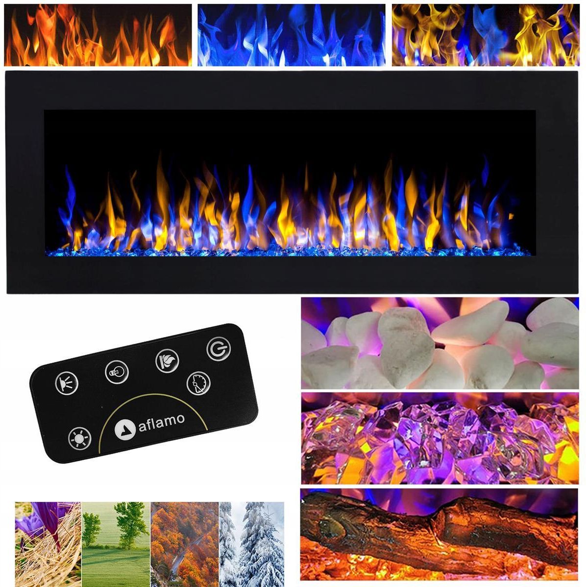 Kominek elektryczny AFLAMO PRIDE B140 Najważniejsze cechy 3 kolory płomienia pilot zdalnego sterowania 3 paleniska: polana, kryształki, kamienie 4 poziomy szybkości płomienia 5 poziomów jasności płomienia Komfort i wygoda Kominek to przede wszystkim relaks! Pilot sterowania umożliwia zmianę funkcji na odległość. Zapewnia wygodę korzystania bez potrzeby wstawania z kanapy. Kominek elektryczny nie wymaga dodatkowej wentylacji. Nie trzeba wietrzyć pomieszczenia i jednocześnie wpuszczać zimnego czy wilgotnego powietrza. Nie musisz otwierać okna i denerwować się hałasem z zewnątrz. Efekt płomienia bez grzania umożliwia korzystanie z kominka przez cały rok, nawet w upalne dni. Ciesz się ogniem kiedy chcesz. Łatwy i szybki montaż Kominek elektryczny zamontujesz samodzielnie w trzech prostych krokach Zainstaluj wieszak zawarty w zestawie. Powieś kominek. Czerp przyjemność z korzystania. Zamontuj jak chcesz! Istnieją trzy sposoby montażu kominek całkowicie wpuszczony w ścianę, kominek częściowo wpuszczony w ścianę, montaż kominka w ścianie. Palenisko i płomień Najbardziej realistyczny efekt płonącego ognia Wybierz najładniejszy płomień Płomień posiada: 3 kolory, 5 poziomów jasności, 4 prędkości palenia. Dopasuj palenisko do swojego stylu 3 rodzaje paleniska w zestawie: polana, kryształy, kamienie. Łatwy w użyciu - oszczędzaj czas i nerwy! Zapomnij o kupowaniu drewna, rąbaniu i magazynowaniu. Koniec z dymem, kurzem, popiołem. Koniec ze sprzątaniem wokół kominka i czyszczeniu samego kominka. Usiądź wygodnie i włącz kominek! Włącz kominek - wyłącz SMOG Kominki elektryczne są ekologiczne. Nie emitują do atmosfery dwutlenku węgla oraz innych szkodliwych substancji. Kominki elektryczne są czyste. Nie zanieczyszczają wnętrz sadzą, czy popiołem. Ekonomiczny Bez obaw o wysokie rachunki Technologia LED zapewnia bardzo niski koszt efektu płomienia, który wynosi około 1-2 gr/h zależnie od modelu. Dane techniczne Typ kominka: do zabudowy i/lub zawieszenia na ścianie (2w1) Technologia efektu płomienia: LED Przybliżona szerokość całkowita (z obudową): 140 cm Przybliżona szerokość wizji ognia: 120 cm Kolor dominujący: czarny Pilot zdalnego sterowania: tak Funkcja grzania: nie Szerokość: 140 cm Wysokość: 55 cm Głębokość: 12,8 cm Waga: 30 kg Kolor / wykończenie: czarna nowoczena obudowa, szklany panel Moc grzewcza: brak Dodatkowe informacje: 3 kolory płomienia; 5 jasności płomienia; 4 prędkości płomienia; 3 rodzaje paleniska w zestawie: polana, kryształy i kamienie Długość kabla zasilającego: 1,8 m Napięcie: 220-230V