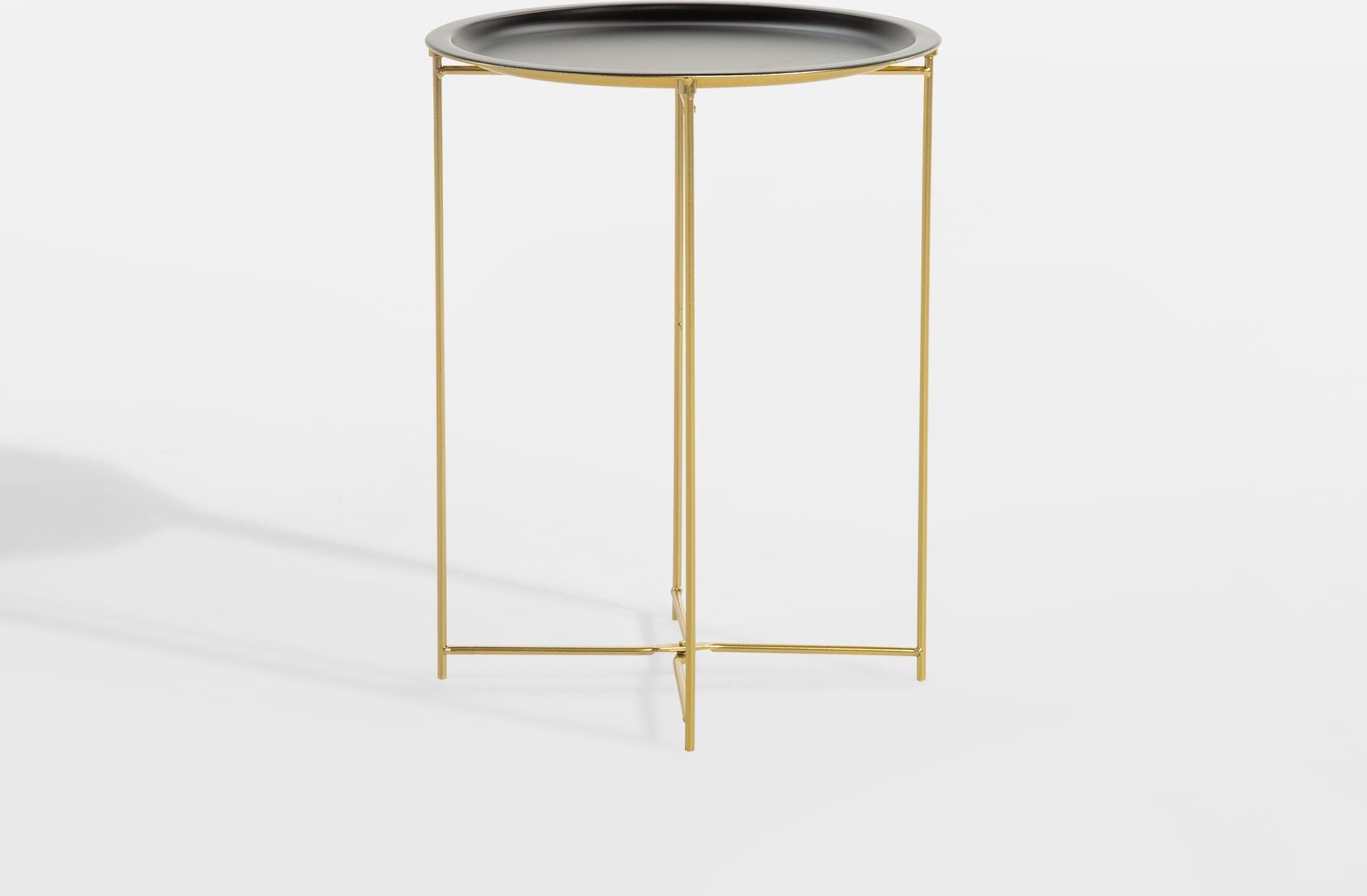 Potrzebujesz szybko postawić na czymś filiżankę i talerzyk? Wybierając składany stolik z tacą, zaoszczędzisz dużo miejsca. Dzięki niemu docenisz praktyczne rozwiązania. Metalowy stolik schowasz w ustronnym miejscu i gdy tylko zajdzie potrzeba, szybko go rozłożysz. Jest niewielkich rozmiarów, więc zabierzesz go ze sobą na wakacje. Podczas urlopu w plenerze każda dodatkowa powierzchnia staje się pomocna. Składany stolik z tacą– wykonanie Czarny blat ma matowe wykończenie. W połączeniu ze złotym, błyszczącym stelażemwygląda elegancko. Średnica stolika wynosi 37 cm. Wysokość: 48 cm. Metalowy, składany stolik sprawdzi się jako dodatkowe miejsce dzbanek z wodą i szklankami. Wykorzystasz go również jako podstawkę na rośliny doniczkowe. Będą się na nim zgrabnie prezentować. Składany stolik wygodnie przeniesiesz z miejsca na miejsce.