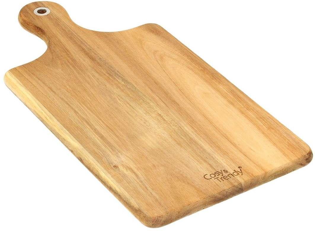 Drewniana deska do krojenia w naturalnym kolorze. Doskonale sprawdzi się podczas krojenia pieczywa czy szatkowania. Poręczny uchwyt i kolor naturalnego drewna sprawia, że ten niezbędny element tworzenia posiłków jest idealnym dodatkiem do każdej kuchni! Wymiary: szer. 41 cm, dł. 20 cm, wys. 1,5 cm.