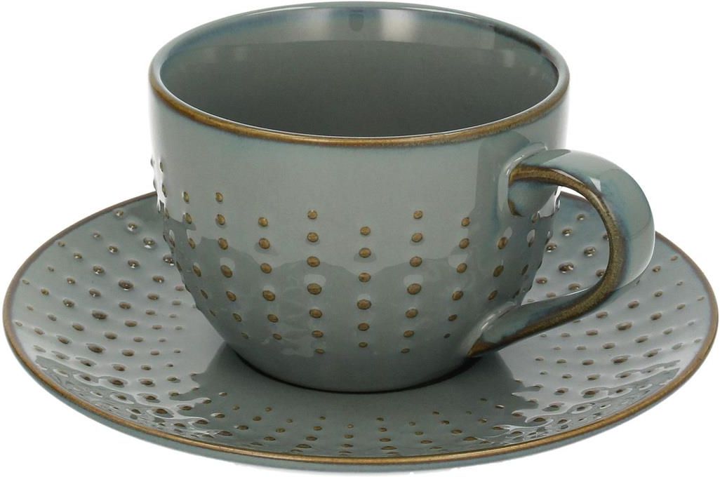 Filiżanka ze spodkiem wykonana z porcelany. Filiżanka ze spodkiem Dossi o fantazyjnym designie wzbogacona oryginalnym wzorem. Szaroniebieski odcień w połączeniu z kolorem antycznego złota tworzy niebanalne zestawienie. Wyjątkowa, wypukła faktura i subtelnie zaznaczony rant, przypadnie do gustu miłośnikom dobrego stylu. Wspaniale sprawdzi się jako filiżanka do kawy lub serwowania innych ulubionych ciepłych napojów. Wspaniale skomponuje się z innymi naczyniami z serii Dossi. Filiżanka wykonana ręcznie z efektem szkliwa. Posiada unikalny kształt, który może nieznacznie różnić się między sobą. Wymiary: filiżanka: szer. 12 cm, dł. 9 cm, wys. 7 cm; spodek: śr. 16 cm, wys. 2 cm.Pojemność: 250 ml. Dodatkowe informacje: produkt można myć w zmywarce i używać w kuchence mikrofalowej.