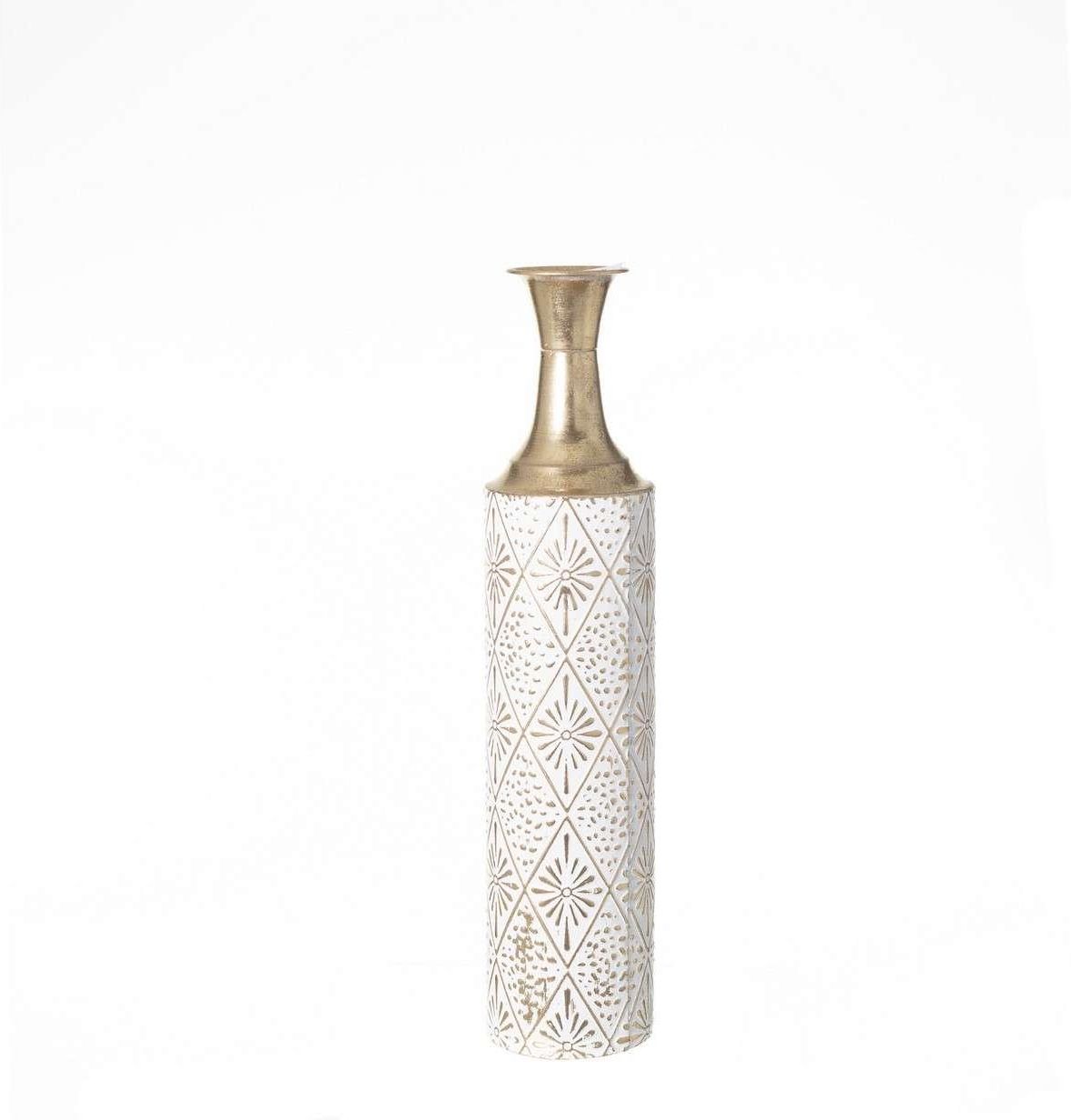 Wazon Nilay 69cm, 15 x 69 cm Kod produktu: 814-467 Metalowy wazon w orientalny wór w kolorze starego złota i bieli. Dekoracyjny wazon o subtelnym zestawieniu kolorystycznym. Delikatne przetarcia oraz orientalny motyw, pozwalają przenieść się w ciepłe, egzotyczne kraje. Wazon idealnie sprawdzi podczas tworzenia własnych kompozycji roślinnych. Pasuje do aranżacji zarówno do stylu vintage, modern colonial czy orient. Elegancką dekorację stworzy w połączeniu z większą wersją wazonu z tej samej serii. Sprawdź również naszą bogatą ofertą innych, wyjątkowych wazonów, a na pewno znajdziesz w niej coś dla siebie! Dane produktu Waga: 1.77kg Rozmiar: 15 x 69 cm Materiał: metal Kolor: biały, antyczne złoto, mosiądz